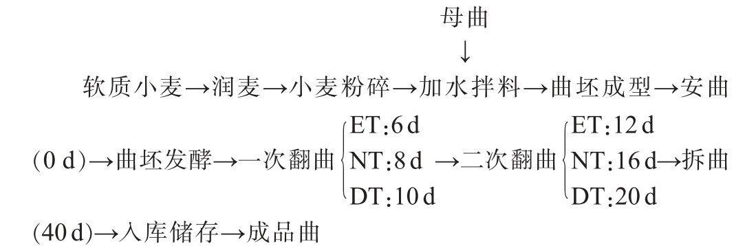 发酵及翻曲:本研究中的3组试验为同一天生产,生产参数一致,安曲于相邻发酵房,每间发酵房的发酵量一致,均为2 500块/间,发酵时间为2024年3月下旬至5月上旬。整个发酵过程跟踪监测室外环境的温度和相对湿度,发酵曲房的温度、相对湿度和二氧化碳含量。其中,提前翻曲(ET)为当曲坯发酵温度达60 ℃时,进行第一次翻曲(6 d);12 d进行第二次翻曲;正常翻曲(NT)为当曲坯发酵温度达顶温时,进行第一次翻曲(8 d);16 d进行第二次翻曲;延后翻曲(DT)为当曲坯发酵温度达顶温并开始下降至60 ℃时,进行第一次翻曲(10 d);20 d进行第二次翻曲。