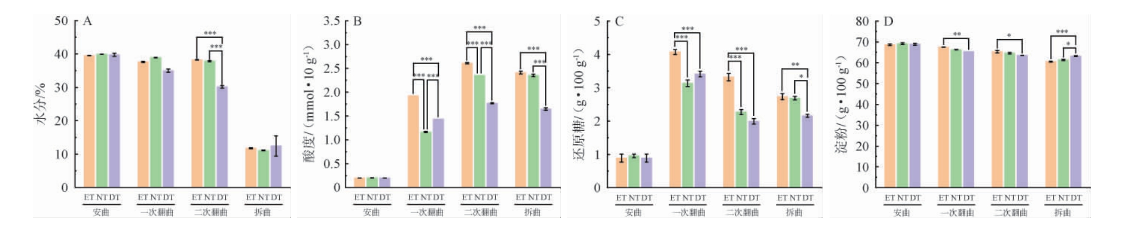 高温大曲的还原糖大部分来自于微生物代谢的淀粉酶降解小麦中的淀粉所产生。 由图2C可知,还原糖含量随发酵时间增加时呈先上升后下降趋势,在一次翻曲的还原糖含量最高,这可能是因为在发酵前期,微生物大量繁殖,代谢产生的淀粉酶分解小麦中的淀粉产生还原糖导致含量呈上升趋势,到发酵中后期,大曲的微生物生长消耗的还原糖大于淀粉酶分解产生的还原糖,从而导致还原糖含量下降。 其中ET组曲坯的还原糖含量在整个发酵过程中高度显著高于其他两组(P<0.001),而DT组在整个发酵过程中最低。