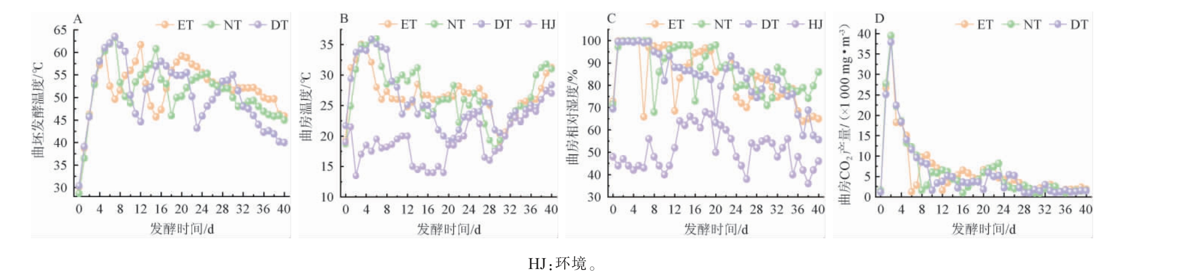 曲房的温度受曲坯发酵升温、室外环境温度及开关门窗通风等的影响。由图1B可知,在发酵0~24 d,曲房温度主要受曲坯发酵温度的影响,曲房温度从第0天的常温到曲坯入仓后开始快速上升,在一次翻曲前都达到了顶温,其中,ET组曲房温度在一次翻曲前达到了34.6 ℃,NT组为36 ℃,DT组为35.6 ℃。 因在进行翻曲时门窗是敞开的,届时环境温度低,故经一次翻曲后曲房的温度逐渐下降。 在整个发酵过程中,曲房的温度始终高于环境(HJ)温度,在二次翻曲后,常开门开窗通风排潮,曲房温度的变化主要受到环境温度的影响。20~40 d,3间曲房的温度也逐渐与外界环境温度一致。