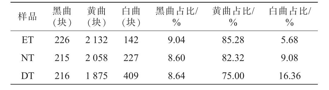 样品 黑曲(块)黄曲(块)白曲(块)黑曲占比/%黄曲占比/%白曲占比/%ET NT DT 226 215 216 2 132 2 058 1 875 142 227 409 9.04 8.60 8.64 85.28 82.32 75.00 5.68 9.08 16.36