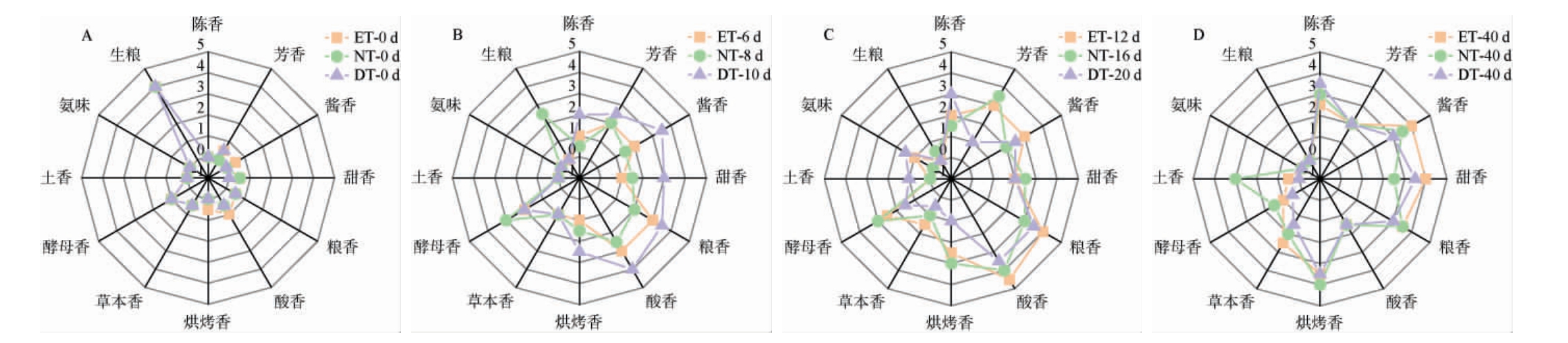 由图5A可知,鲜坯的曲坯香气以生粮香(生麦粉香)为主,主要是小麦香。由图5B可知,第一次翻曲,ET曲坯香气以酸香和粮香(黄粑粽香)为主;NT曲坯香气以芳香、酵母香、酸香和粮香为主;DT曲坯香气以酸香、甜香、酱香为主,此时的酱香是生酱味。由图5C可知,第二次翻曲,ET曲坯酸香和粮香突出,酱香;NT曲坯芳香(花香、水果香、醇香)突出;DT曲坯陈香突出,其他香气较弱。由图5D可知,拆曲时ET的酱香、甜香、粮香、草木香突出;NT的烘烤香、酱香、土香突出;DT的陈香最为突出,但其他香气整体弱于提前翻曲和正常翻曲;都无异香。总的来说,提前翻曲(ET)有利于提高大曲的烘焙香和酱香,这可能和ET中吡嗪类、醛类物质含量高有关[33]。