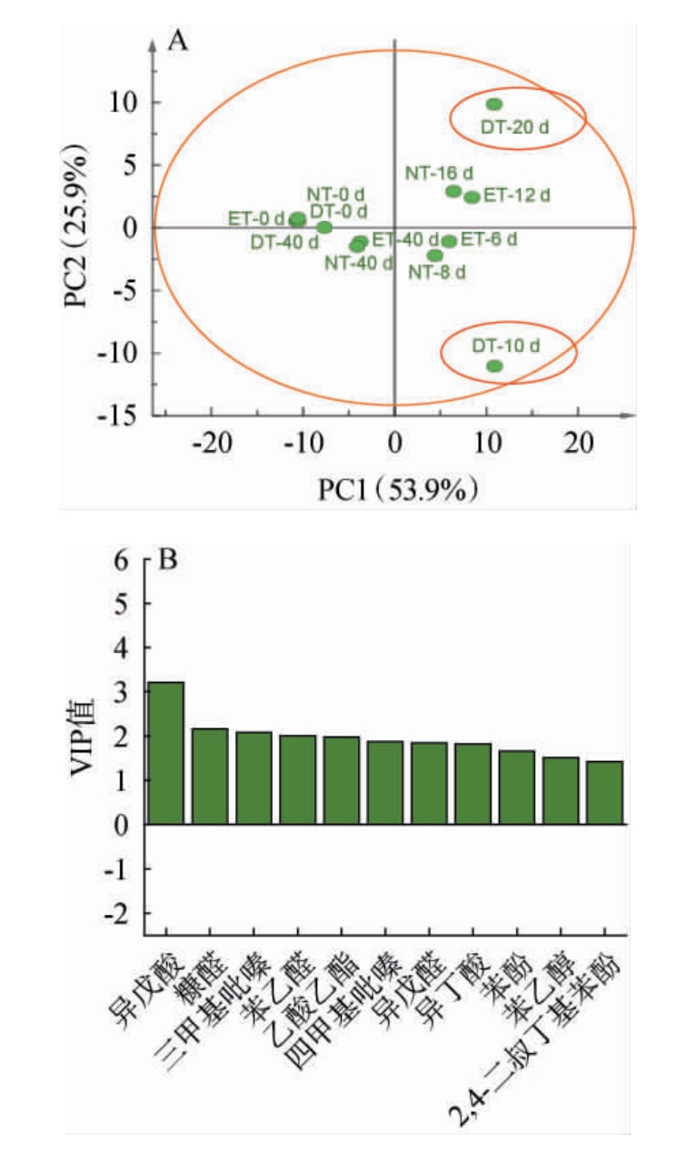 Fig.4 Principal component analysis results (A) and variable importance in the projection values (B) of volatile flavor compounds in hightemperature Daqu samples with different turning time