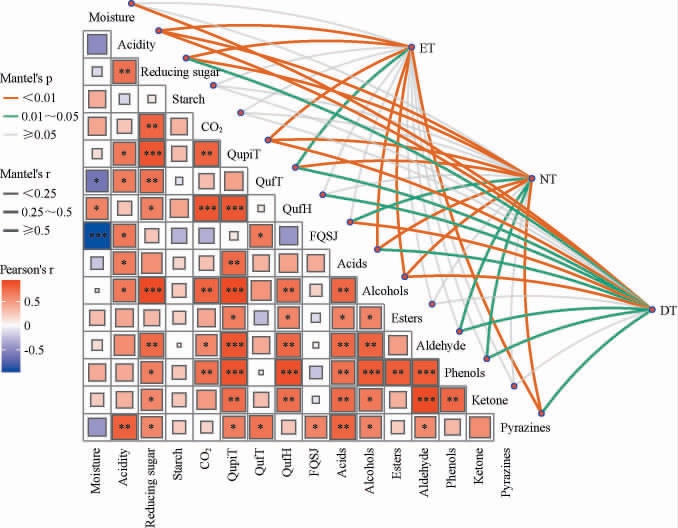 橙色线条表示影响极显著(P<0.01),绿色线条表示影响显著(0.01≤P<0.05),灰色线条表示影响不显著(P≥0.05),线条粗细表示相关性强度(r值);蓝色方形表示负相关、白色方形表示无相关、红色方形表示正相关;“*”表示相关性显著(P<0.05),“**”表示相关性极显著(P<0.01),“***”表示相关性高度显著(P<0.001)。Moisture(水分);Acidity(酸度);Reducing sugar(还原糖);Starch(淀粉);CO2(曲房CO2含量);QupiT(曲坯温度);QufT(曲房温度);QufH(曲房相对湿度);FQSJ(翻曲时间);Acids(酸类);Alcohols(醇类);Esters(酯类);Aldehyde(醛类);Phenols(酚类);Ketone(酮类);Pyrazines(吡嗪类)。