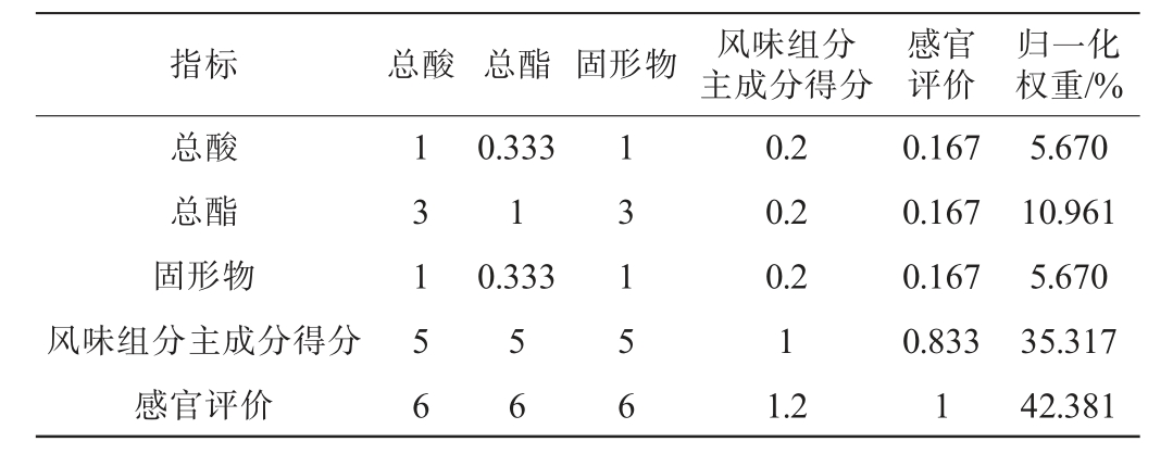 层次分析法(analytic hierarchy process,AHP)是一种经典的多准则决策工具,其核心优势在于能够将复杂问题结构化,并对定性判断进行量化。模型构建主要参考罗生霞等[16]的方法,并依据本研究对象的特点稍作修改,最终确定以总酸含量、总酯含量、固形物含量、挥发性风味组分及感官评分五大指标作为评价体系。