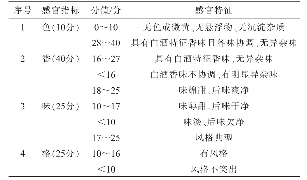 序号 感官指标 分值/分 感官特征1 2 3 4色(10分)香(40分)无色或微黄、无悬浮物、无沉淀杂质具有白酒特征香味且各味协调、无异杂味具有白酒特征香味、无异杂味白酒香味不协调、有明显异杂味味(25分)格(25分)0~10 28~40 16~27<16 18~25 10~17<10 17~25 10~16<10味绵甜、后味爽净味醇甜、后味干净味淡、后味欠净风格典型有风格风格不突出
