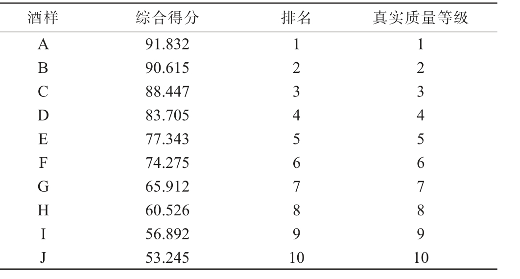 由表6可知,10个酒样的综合得分排序与真实质量等级一致,说明层次分析法作为质量评价赋权模型效果好。