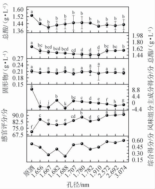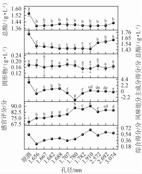 对11种活性炭处理前后的涩味酒样指标进行分析,结果见图4。由图4可知,经活性炭处理后,涩味浓香型白酒的总酸、总酯含量以及挥发性风味组分的主成分得分均出现显著降低(P<0.05),而固形物含量未见明显变化(P>0.05),感官评分显著提高(P<0.05)。不同活性炭处理后的酒样之间总酸含量无显著差异(P>0.05),表明活性炭孔径对酸类物质的吸附效果影响不大。 在总酯含量方面,当活性炭孔径<2 nm时,总酯含量随孔径增大而显著下降(P<0.05),其中孔径为1.910 nm时酯损失最大,达0.53 g/L;孔径>2 nm时,总酯含量则随孔径增大而上升,且该区间的酒样总酯含量显著高于孔径<2 nm的处理组。这说明活性炭对酯类物质的吸附能力在微孔范围内随孔径增大而增强,而在中孔范围内则随孔径增大而减弱,微孔活性炭对酯类化合物的吸附效果优于中孔活性炭。 在挥发性风味组分方面,经3.074 nm孔径活性炭处理的酒样损失最小,而1.667 nm孔径处理组损失最大。感官评分方面,所有处理组均较原酒显著提升(P<0.05)。其中,1.782 nm孔径的活性炭提升幅度最大,感官评分提高了18.3分。随着活性炭孔径增大,酒样综合得分呈现先升高后下降并趋于平稳的趋势,孔径为2.572 nm、2.692 nm和3.074 nm的活性炭处理酒样综合得分优于原酒,以2.572 nm孔径活性炭综合得分最高,达0.57分。