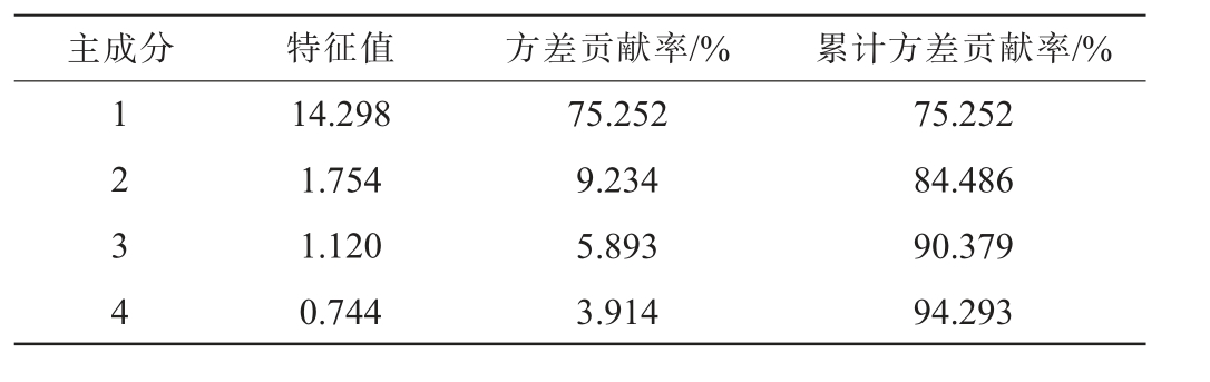 主成分 特征值 方差贡献率/% 累计方差贡献率/%1 2 3 4 14.298 1.754 1.120 0.744 75.252 9.234 5.893 3.914 75.252 84.486 90.379 94.293