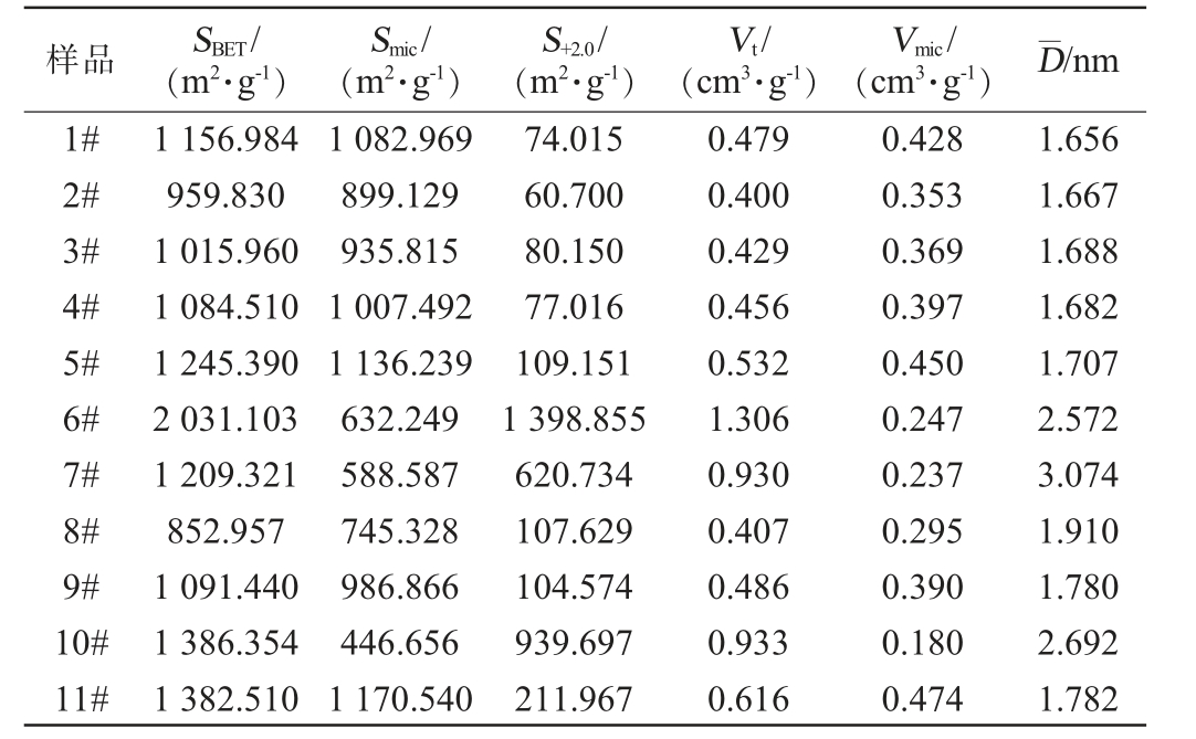 样品 SBET/(m2·g-1)Smic/(m2·g-1)S+2.0/(m2·g-1)Vt/(cm3·g-1)Vmic/(cm3·g-1) D/nm 1#2#3#4#5#6#7#8#9#10#11#1 156.984 959.830 1 015.960 1 084.510 1 245.390 2 031.103 1 209.321 852.957 1 091.440 1 386.354 1 382.510 1 082.969 899.129 935.815 1 007.492 1 136.239 632.249 588.587 745.328 986.866 446.656 1 170.540 74.015 60.700 80.150 77.016 109.151 1 398.855 620.734 107.629 104.574 939.697 211.967 0.479 0.400 0.429 0.456 0.532 1.306 0.930 0.407 0.486 0.933 0.616 0.428 0.353 0.369 0.397 0.450 0.247 0.237 0.295 0.390 0.180 0.474 1.656 1.667 1.688 1.682 1.707 2.572 3.074 1.910 1.780 2.692 1.782