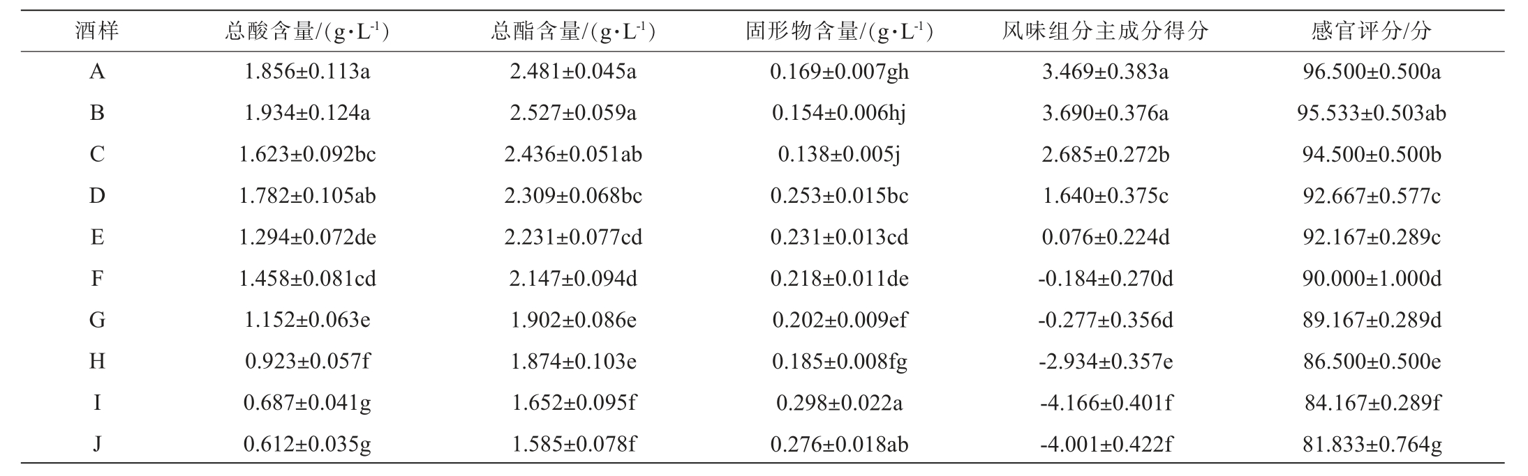 酒样 总酸含量/(g·L-1) 总酯含量/(g·L-1) 固形物含量/(g·L-1) 风味组分主成分得分 感官评分/分ABCDEFGHIJ 1.856±0.113a 1.934±0.124a 1.623±0.092bc 1.782±0.105ab 1.294±0.072de 1.458±0.081cd 1.152±0.063e 0.923±0.057f 0.687±0.041g 0.612±0.035g 2.481±0.045a 2.527±0.059a 2.436±0.051ab 2.309±0.068bc 2.231±0.077cd 2.147±0.094d 1.902±0.086e 1.874±0.103e 1.652±0.095f 1.585±0.078f 0.169±0.007gh 0.154±0.006hj 0.138±0.005j 0.253±0.015bc 0.231±0.013cd 0.218±0.011de 0.202±0.009ef 0.185±0.008fg 0.298±0.022a 0.276±0.018ab 3.469±0.383a 3.690±0.376a 2.685±0.272b 1.640±0.375c 0.076±0.224d-0.184±0.270d-0.277±0.356d-2.934±0.357e-4.166±0.401f-4.001±0.422f 96.500±0.500a 95.533±0.503ab 94.500±0.500b 92.667±0.577c 92.167±0.289c 90.000±1.000d 89.167±0.289d 86.500±0.500e 84.167±0.289f 81.833±0.764g
