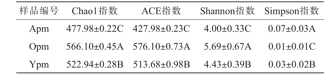 样品编号 Chao1指数 ACE指数 Shannon指数 Simpson指数Apm Opm Ypm 477.98±0.22C 566.10±0.45A 522.94±0.28B 427.98±0.23C 576.10±0.73A 513.68±0.98B 4.00±0.33C 5.69±0.67A 4.43±0.39B 0.07±0.03A 0.01±0.01C 0.03±0.02B