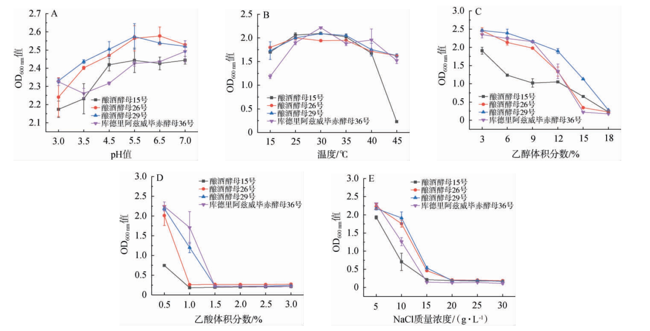 将活化后的菌株按照2%(V/V)接种量接种于YPD培养基中,30 ℃培养2 d,分别考察乙酸体积分数(0.5%、1.0%、1.5%、2.0%、2.5%、3.0%)、乙醇体积分数(3%、6%、9%、12%、15%、18%)、pH(3.0、3.5、4.5、5.5、6.5、7.0)、温度(15 ℃、25 ℃、30 ℃、35 ℃、40 ℃、45 ℃)和NaCl质量浓度(5 g/L、10 g/L、15 g/L、20 g/L、25 g/L、30 g/L)对菌株生长的影响,用紫外分光光度计在波长600 nm处测定发酵液OD600nm值。