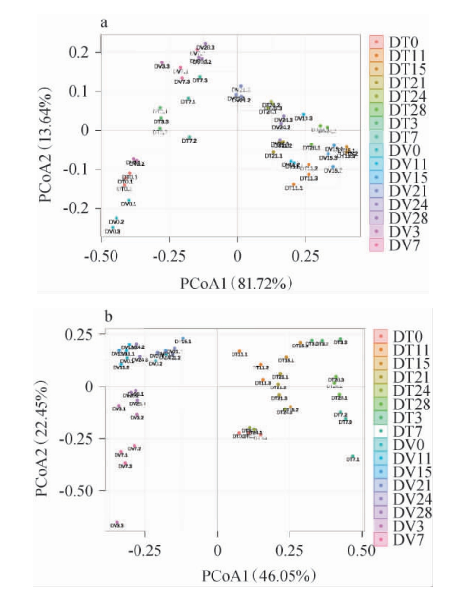 由图1a可知,DV、DT组酒醅沿PCoA1轴显著分离(解释率81.72%),表明PMA预处理对酒醅细菌群落的组成和分布具有显著影响(P<0.05),发酵0 d时,DT与DV组酒醅样本点高度重叠,表明初始菌群结构具有一致性;但随着发酵进行,两样本组细菌群落结构逐渐产生差异;发酵3~7 d时,两组样本分化并形成独立的聚类区域;发酵21 d时,两组样本的分离程度达到最大,直至酒醅发酵结束(28 d)。此外,同一处理组内不同发酵天数的酒醅样本沿PCoA2轴逐渐分散,体现了发酵时间对群落结构的塑造作用。由图1b可知,DV组酒醅样品聚集在左侧,DT组酒醅样品聚集在右侧,两样本组的聚类趋势差异相较于细菌群落更明显,且同一处理组内的样本随发酵时间延长沿PCoA2轴扩散。这一结果表明总微生物菌群与活微生物菌群存在显著差异(P<0.05)。