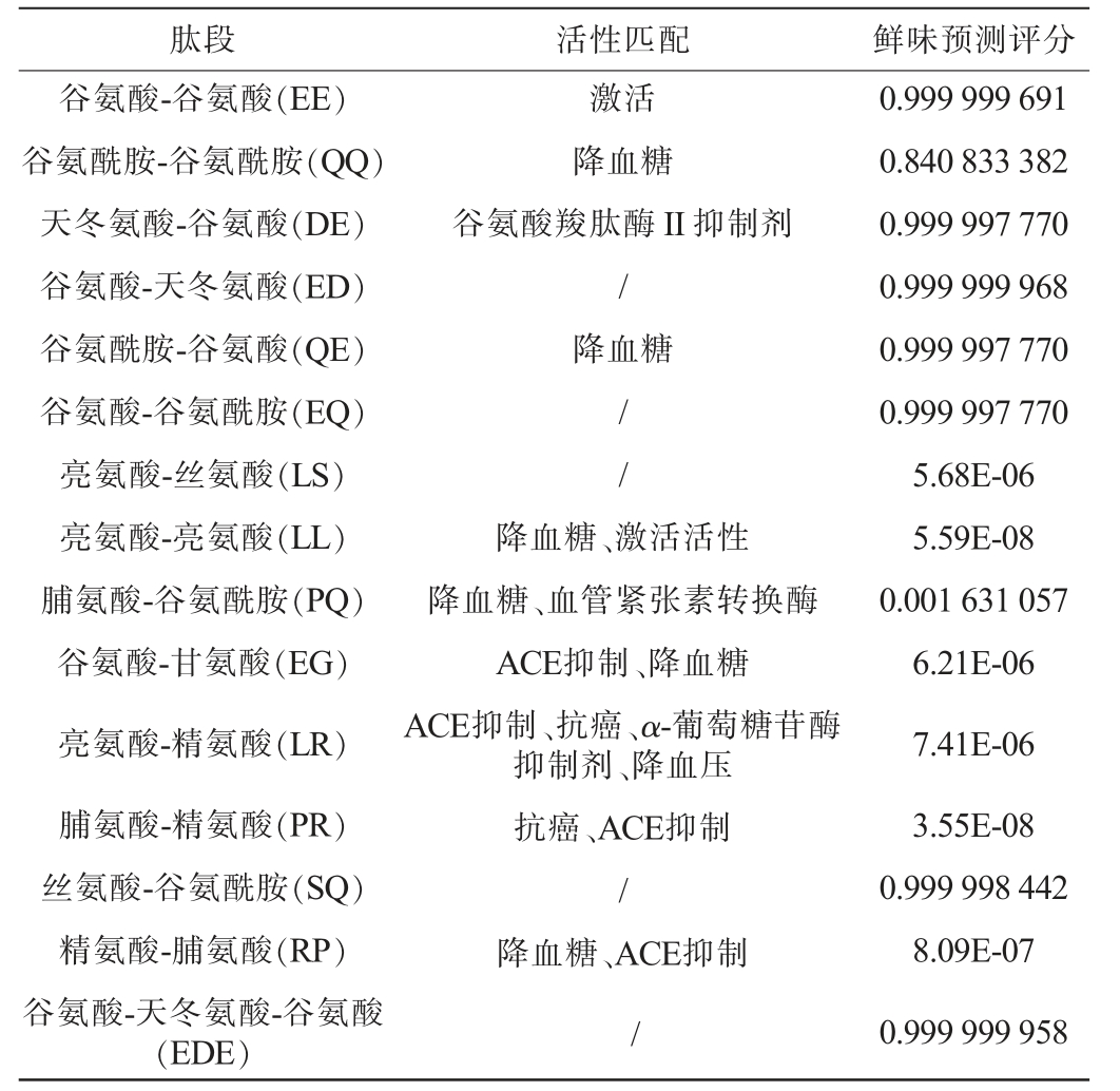 肽段 活性匹配 鲜味预测评分谷氨酸-谷氨酸(EE)谷氨酰胺-谷氨酰胺(QQ)天冬氨酸-谷氨酸(DE)谷氨酸-天冬氨酸(ED)谷氨酰胺-谷氨酸(QE)谷氨酸-谷氨酰胺(EQ)亮氨酸-丝氨酸(LS)亮氨酸-亮氨酸(LL)脯氨酸-谷氨酰胺(PQ)谷氨酸-甘氨酸(EG)亮氨酸-精氨酸(LR)脯氨酸-精氨酸(PR)丝氨酸-谷氨酰胺(SQ)精氨酸-脯氨酸(RP)谷氨酸-天冬氨酸-谷氨酸(EDE)激活降血糖谷氨酸羧肽酶II 抑制剂/降血糖//降血糖、激活活性降血糖、血管紧张素转换酶ACE抑制、降血糖ACE抑制、抗癌、α-葡萄糖苷酶抑制剂、降血压抗癌、ACE抑制/降血糖、ACE抑制/0.999 999 691 0.840 833 382 0.999 997 770 0.999 999 968 0.999 997 770 0.999 997 770 5.68E-06 5.59E-08 0.001 631 057 6.21E-06 7.41E-06 3.55E-08 0.999 998 442 8.09E-07 0.999 999 958