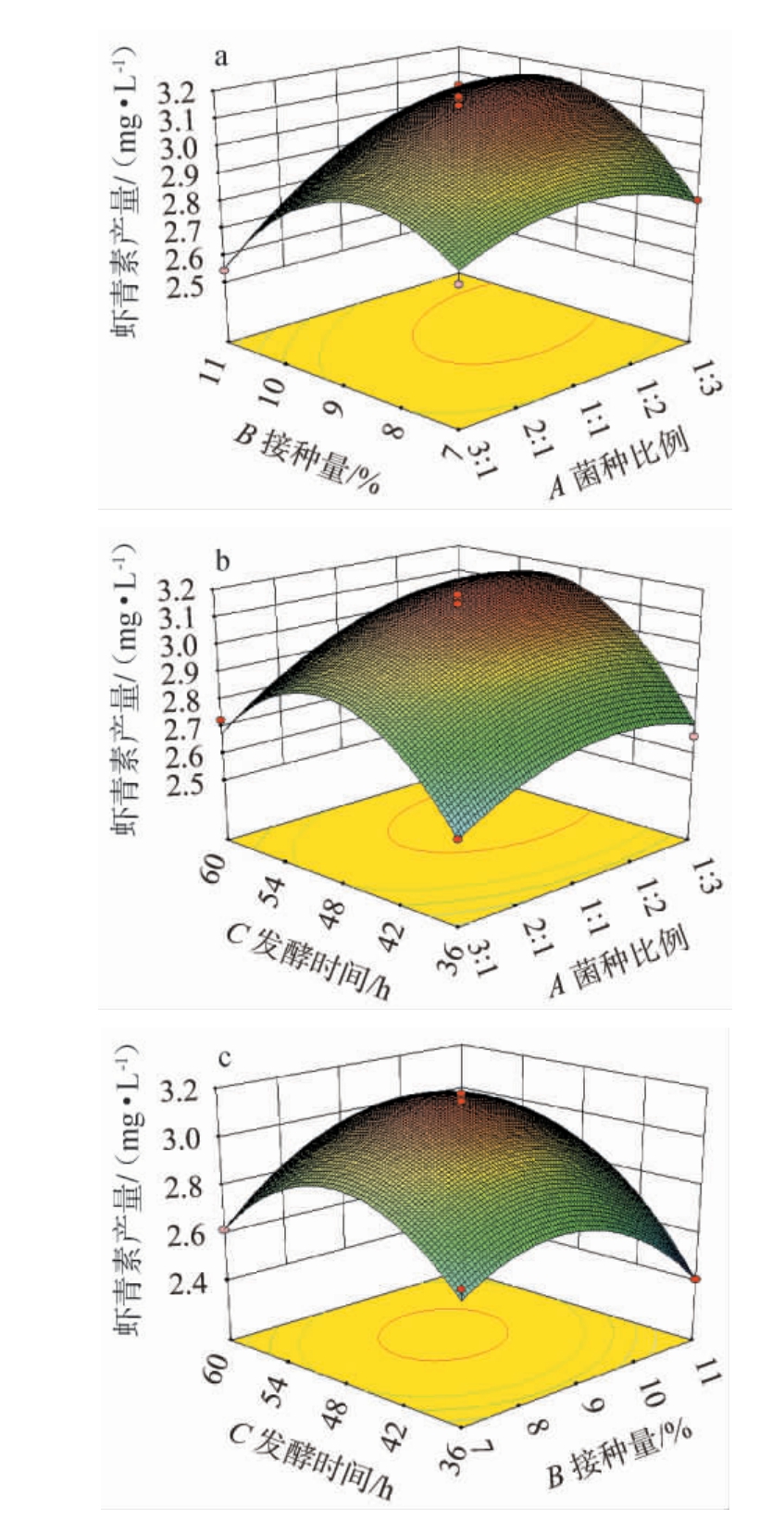 由图5a可知,响应曲面较陡峭,菌种比例的曲面倾斜度大于接种量的倾斜度,说明菌种比例对虾青素产量的影响大于接种量,等高线呈密集的椭圆形,表明菌种比例和接种量之间存在较强的交互作用,且两因素对虾青素产量的影响显著。由图5b可知,等高线接近圆形,表明菌种比例和发酵时间之间的交互作用较弱,且两因素对虾青素产量影响不显著。由图5c可知,随着接种量的增加和发酵时间的延长,虾青素含量先升高后,响应曲面较陡峭,且发酵时间的曲面倾斜度大于接种量的倾斜度,说明发酵时间对虾青素产量的影响大于接种量,等高线呈现密集的椭圆形,表明接种量和发酵时间之间的交互作用较强,对虾青素产量的影响显著。