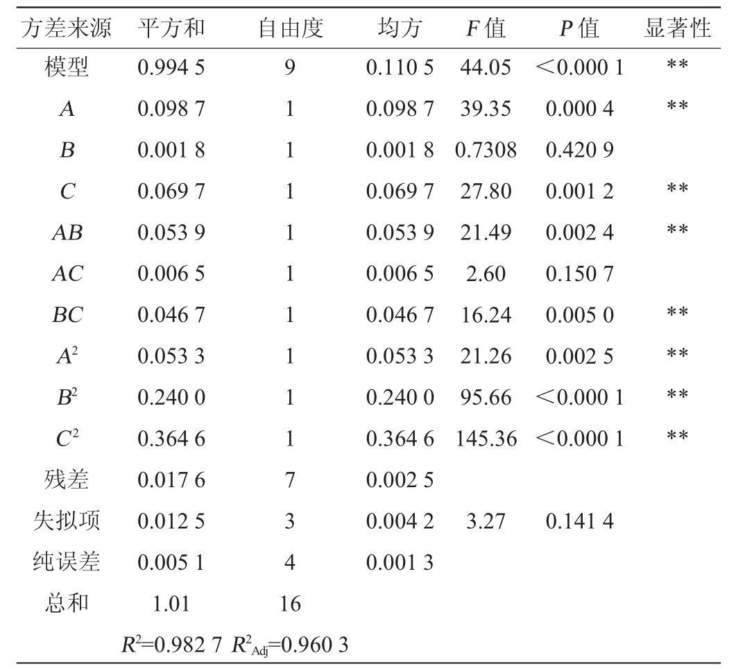 方差来源 平方和 自由度 均方 F 值 P 值 显著性模型ABCA B********AC BC A2 B2 C2残差失拟项纯误差总和0.994 5 0.098 7 0.001 8 0.069 7 0.053 9 0.006 5 0.046 7 0.053 3 0.240 0 0.364 6 0.017 6 0.012 5 0.005 1 1.01 R2=0.982 7 9 1 1 1 1 1 1 1 1 1 7 3 4 1 6 0.110 5 0.098 7 0.001 8 0.069 7 0.053 9 0.006 5 0.046 7 0.053 3 0.240 0 0.364 6 0.002 5 0.004 2 0.001 3 44.05 39.35 0.7308 27.80 21.49 2.60 16.24 21.26 95.66 145.36<0.000 1 0.000 4 0.420 9 0.001 2 0.002 4 0.150 7 0.005 0 0.002 5<0.000 1<0.000 1********3.27 0.141 4 R2Adj=0.960 3