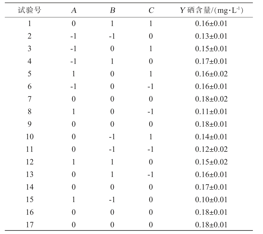 试验号 A B C Y 硒含量/(mg·L-1)1234567891 0 0 1-1-1-1 1-1-1 0100000-1 10101-10-11 12 13 14 15 16 17 01000100100-1 101-110-10-100 10000 0.16±0.01 0.13±0.01 0.15±0.01 0.17±0.01 0.16±0.02 0.16±0.01 0.18±0.02 0.11±0.01 0.18±0.01 0.14±0.01 0.12±0.02 0.15±0.02 0.16±0.01 0.17±0.01 0.10±0.01 0.18±0.01 0.18±0.01