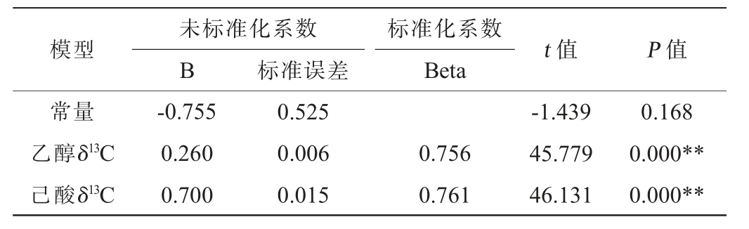 表10 白酒中乙醇δ13C、己酸δ13C及己酸乙酯δ13C多元线性回归模型方差分析结果