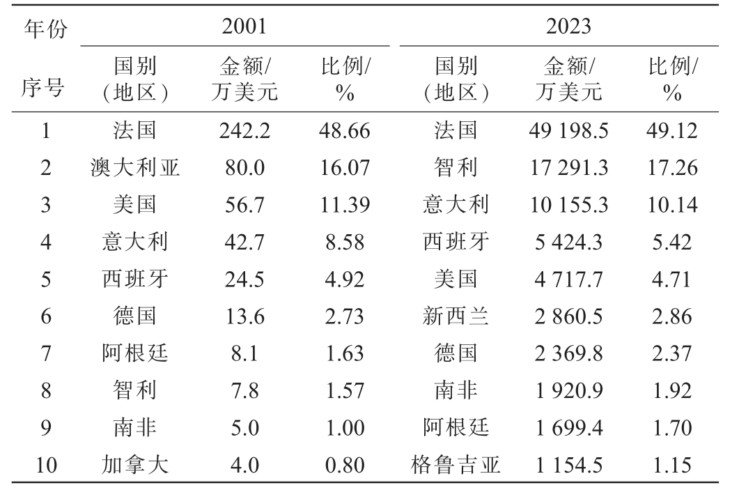 表1 2001年和2023年中国葡萄酒进口贸易前十位市场来源