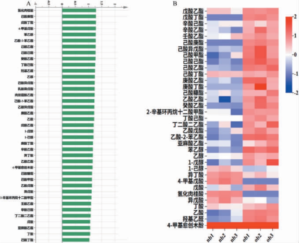 图6 基于偏最小二乘法判别分析新老窖酒醅中的差异挥发性化合物(A)及下层酒醅中差异挥发性化合物含量热图(B)