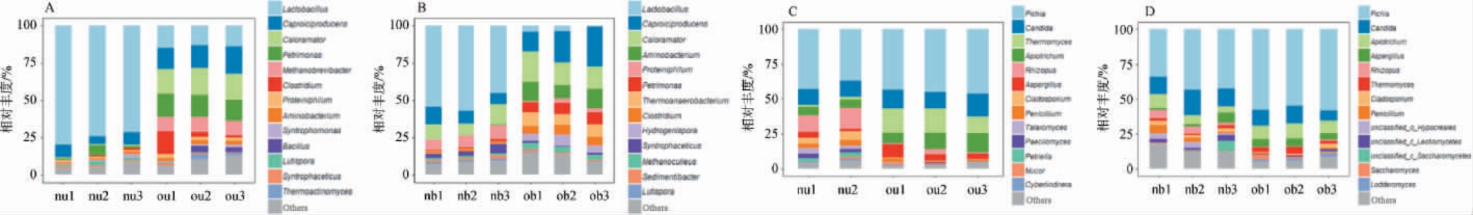 由图3A和图3B可知,老窖池窖泥(ou,ob)的细菌群落丰富度高于新窖池(nu,nb),在新窖池中,乳酸菌属(Lactobacillus)为绝对优势菌,占整个群落结构相对丰度的50%以上。 而老窖池中以乳酸杆菌属(Lactobacillus),产己酸菌属(Caproiciproducens),喜热菌属(Caloramator)等多菌属为主。 研究表明,产己酸菌属(Caproiciproducens)广泛分布于高温厌氧环境和发酵系统中,能够将果糖等底物转化为乳酸、乙酸、丁酸、己酸、氢气和二氧化碳,是正常窖池窖泥中的优势菌属之一[25]。 由图3C和图3D可知,毕赤酵母属(Pichia)为新老窖池上下层窖泥中的绝对优势菌,相对丰度为30%~55%,整体看窖池上层的真菌群落结构丰富度要高于下层。 上述差异表明,老窖通过长期发酵已建立稳定的功能菌群体系,特别是下层富集的产己酸菌群为风味物质合成提供了基础,而新窖菌群仍处于演替阶段。