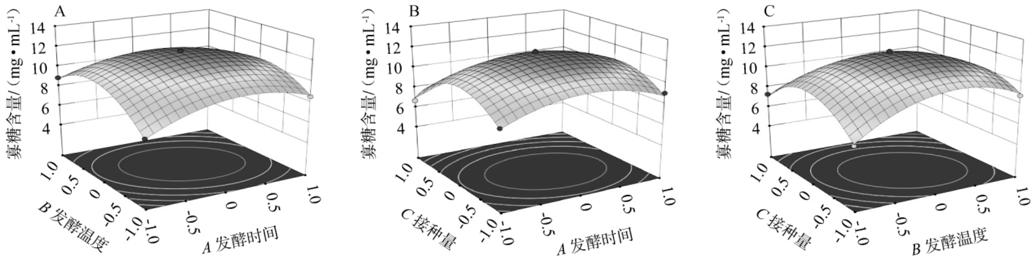 各因素交互作用对黄精寡糖含量影响的响应面及等高线见图3。由图3可知,发酵时间(A)与发酵温度(B),发酵温度(B)与菌种接种量(C)之间的交互作用表现出陡峭的斜率,且其等高线图呈明显的椭圆形,表明这些交互作用对寡糖含量具有极显著影响[21],而发酵时间(A)与菌种接种量(C)之间的交互作用较弱[22]。这与方差分析结果一致。通过Design-Expert软件对多元二次回归方程进行求解,并根据实际操作条件进行修正,得到降解黄精多糖产寡糖菌株最佳发酵条件为发酵时间5 d,发酵温度35 ℃,菌种接种量4%。在此条件下重复3次验证试验,发酵液中的黄精寡糖含量达到21.81mg/mL,相较于优化前提高了23.74%。研究表明,黄精在炮制过程中,寡糖类成分(如D-蔗糖、棉子糖、蜜二糖)含量显著降低,而单糖类成分(如D-果糖、D-葡萄糖)含量增加[23],说明利用植物乳植杆菌发酵是积累多糖的有效方式。