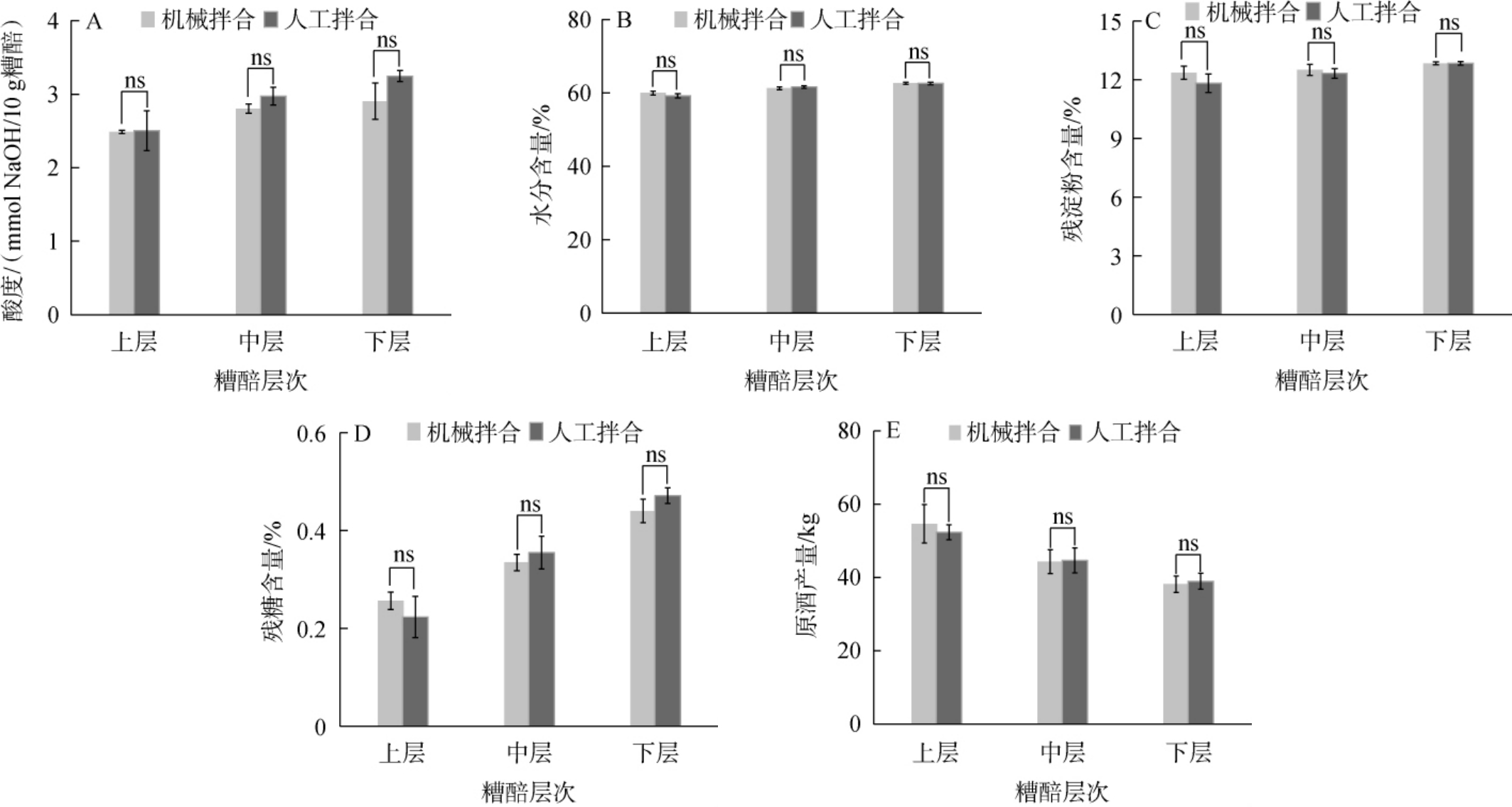 由图4可知,经仿生柔性自动拌和机拌和的糟醅经下轮次发酵后,上层、中层和下层出窖糟醅酸度分别为2.49 mmol NaOH/10 g糟醅、2.80 mmol NaOH/10 g糟醅和2.91 mmol NaOH/10 g糟醅,水分含量分别为60.00%、61.25%和62.63%,残淀粉含量分别为12.36%、15.50%和12.84%,残糖含量分别为0.26%、0.34%和0.44%;人工拌合的糟醅经下轮次发酵后上层、中层和下层出窖糟醅酸度分别为2.50 mmol NaOH/10 g糟醅、2.98 mmol NaOH/10 g糟醅和3.25 mmol NaOH/10 g糟醅,水分含量分别为59.23%、61.61%和62.59%,残淀粉含量分别为11.83%、12.32%和12.84%,残糖含量分别为0.22%、0.36%0.47%。 2种拌和方式的出窖糟醅理化指标无显著差异(P>0.05),且与张霞等[20]报道浓香型白酒发酵过程中出窖糟醅理化指标检测结果一致。经仿生柔性自动拌和机拌和糟醅经下轮次发酵,上层、中层和下层出窖糟醅的原酒产量分别为54.67 kg、44.33 kg、38.20 kg;经人工拌和糟醅经下轮次发酵,上层、中层和下层出窖糟醅的原酒产量分别为52.33 kg、44.67 kg、39.01 kg,2种拌和方式对下轮次发酵的出窖糟醅原酒产量无显著差异(P>0.05)。以上结果表明,与人工拌合方式相比,仿生柔性自动拌和机拌合对下轮次发酵的出窖糟醅理化指标和原酒产量无明显差异。
