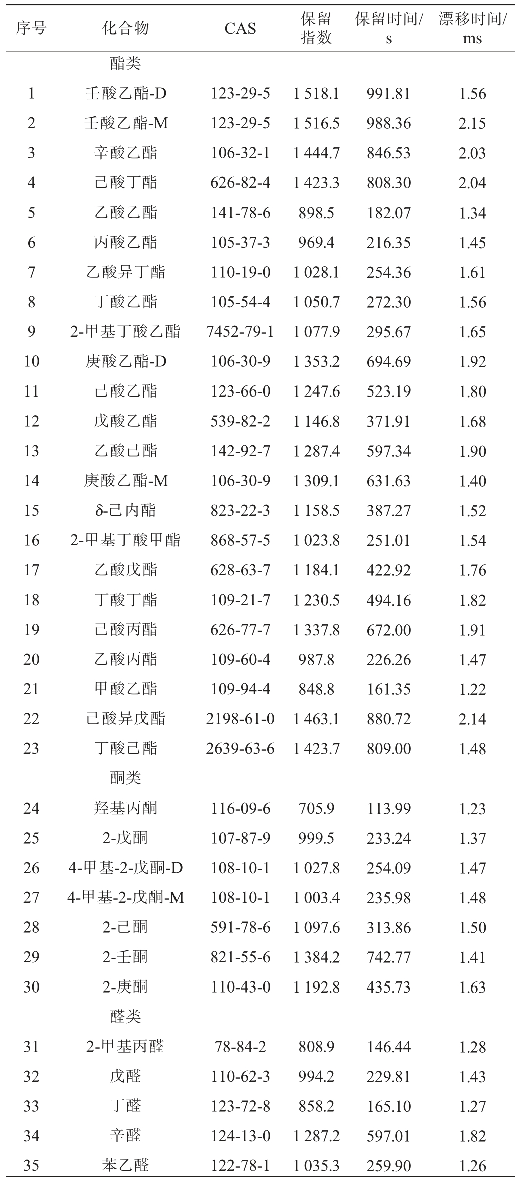 序号化合物CAS保留指数保留时间/s漂移时间/ms 1234567891 0 11 12 13 14 15 16 17 18 19 20 21 22 23 123-29-5 123-29-5 106-32-1 626-82-4 141-78-6 105-37-3 110-19-0 105-54-4 7452-79-1 106-30-9 123-66-0 539-82-2 142-92-7 106-30-9 823-22-3 868-57-5 628-63-7 109-21-7 626-77-7 109-60-4 109-94-4 2198-61-0 2639-63-6 1 518.1 1 516.5 1 444.7 1 423.3 898.5 969.4 1 028.1 1 050.7 1 077.9 1 353.2 1 247.6 1 146.8 1 287.4 1 309.1 1 158.5 1 023.8 1 184.1 1 230.5 1 337.8 987.8 848.8 1 463.1 1 423.7 991.81 988.36 846.53 808.30 182.07 216.35 254.36 272.30 295.67 694.69 523.19 371.91 597.34 631.63 387.27 251.01 422.92 494.16 672.00 226.26 161.35 880.72 809.00 1.56 2.15 2.03 2.04 1.34 1.45 1.61 1.56 1.65 1.92 1.80 1.68 1.90 1.40 1.52 1.54 1.76 1.82 1.91 1.47 1.22 2.14 1.48 24 25 26 27 28 29 30 116-09-6 107-87-9 108-10-1 108-10-1 591-78-6 821-55-6 110-43-0 705.9 999.5 1 027.8 1 003.4 1 097.6 1 384.2 1 192.8 113.99 233.24 254.09 235.98 313.86 742.77 435.73 1.23 1.37 1.47 1.48 1.50 1.41 1.63 31 32 33 34 35酯类壬酸乙酯-D壬酸乙酯-M辛酸乙酯己酸丁酯乙酸乙酯丙酸乙酯乙酸异丁酯丁酸乙酯2-甲基丁酸乙酯庚酸乙酯-D己酸乙酯戊酸乙酯乙酸己酯庚酸乙酯-M δ-己内酯2-甲基丁酸甲酯乙酸戊酯丁酸丁酯己酸丙酯乙酸丙酯甲酸乙酯己酸异戊酯丁酸己酯酮类羟基丙酮2-戊酮4-甲基-2-戊酮-D 4-甲基-2-戊酮-M 2-己酮2-壬酮2-庚酮醛类2-甲基丙醛戊醛丁醛辛醛苯乙醛78-84-2 110-62-3 123-72-8 124-13-0 122-78-1 808.9 994.2 858.2 1 287.2 1 035.3 146.44 229.81 165.10 597.01 259.90 1.28 1.43 1.27 1.82 1.26