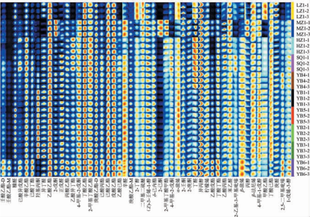 10种浓香型白酒挥发性风味化合物GC-IMS指纹图谱见图3。对所有峰的指纹图谱进行对比可以看出,宜宾产地的YB6样品中所含挥发性化合物种类和含量最为丰富。四川绵竹的样品MZ1和四川泸州的样品LZ1所含挥发性化合物种类最少。但是LZ1的辛酸乙酯、δ-己内酯和糠醛含量较其他样品更高。辛酸乙酯具有类似菠萝的甜香,δ-己内酯具有椰子的香气,而糠醛具有类似杏仁和焦糖样香气,表明LZ1样品可能具有更高的焦甜香气,符合泸州浓香型白酒“绵甜甘冽”的风味特征。MZ1的异丁醛、辛醛、庚酸乙酯和二甲基二硫醚的含量较其他样品更高。白酒中低碳链醛类,沸点低,易挥发,在浓香型白酒中有助于丰富酒香的层次感[21]。