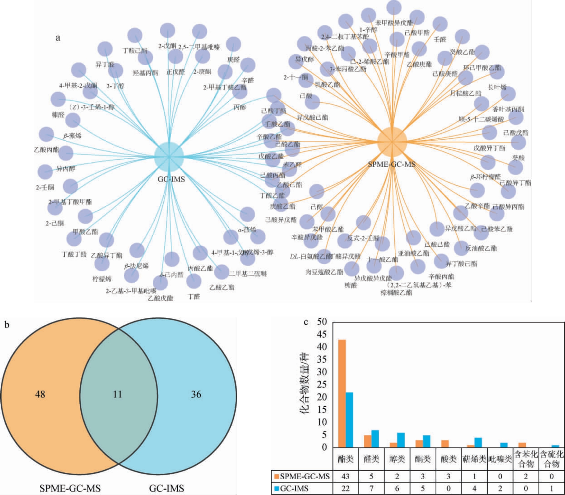Fig.4 Comparison of detection results of volatile flavor compounds between SPME-GC-MS and GC-IMS