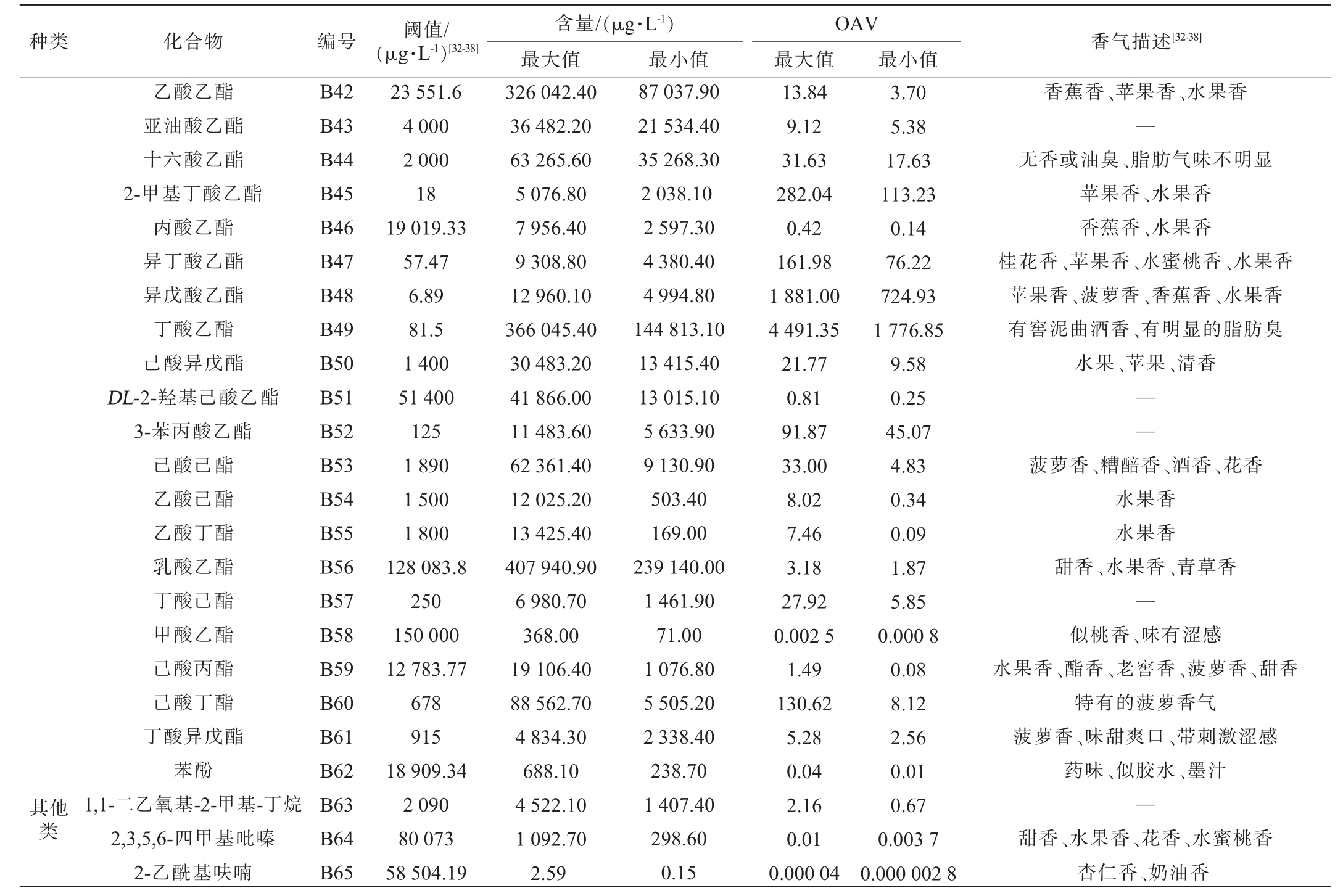 种类化合物编号阈值/(μg·L-1)[32-38]香气描述[32-38]含量/(μg·L-1)最大值最小值OAV最大值最小值醇类醛类酸类酮类水果香焦糖香、吐司香、烧焦橡胶气味青草、树脂、奶油香花香、柑橘香、似清漆、似肥皂醇香、水果香、似葡萄酒、醚样气味水果香、臭水果香、青草、杂醇油气味呈杂醇油、麦芽香、似葡萄酒水果香、花香、青草香水果香水蜜桃香、杂醇油臭、水果香、花香、蜜香—芳香、辛辣、过量涩味焦糊臭、坚果香、馊香花香、水果香、清香、酵母香气花香、水果香过熟水果香、脂肪气味苹果香醋酸气味汗臭、动物臭、酸臭、甜香、水果香油脂腐臭酸臭、汗臭、窖泥臭、霉臭窖泥臭、汗臭、酸臭水果香、花香、油脂臭汗臭、酸臭、窖泥臭醋气味、干酪味、动物(山羊)蜡气味刺激味、略香—刺激的芳香味玫瑰香、蜂蜜香花香、水果香、蜜香、甜香梨子香、荔枝香、水果香、甜香、百合花香菠萝香、水果香、花香酯类正戊醇糠醇正己醇正辛醇2-戊醇异戊醇正丁醇异丁醇丙醇仲丁醇2-庚醇苯乙醇乙缩醛糠醛异戊醛丁醛异丁醛2-甲基丁醛乙酸己酸异丁酸庚酸正戊酸辛酸丁酸丙酸棕榈酸3-羟基-2-丁酮2-庚酮2-戊酮苯乙酸乙酯庚酸乙酯辛酸乙酯癸酸乙酯十八酸乙酯油酸乙酯丁二酸二乙酯壬酸乙酯己酸乙酯乙酸异戊酯十四酸乙酯B1 B2 B3 B4 B5 B6 B7 B8 B9 B10 B11 B12 B13 B14 B15 B16 B17 B18 B19 B20 B21 B22 B23 B24 B25 B26 B27 B28 B29 B30 B31 B32 B33 B34 B35 B36 B37 B38 B39 B40 B41 37 400 2 000 5 370 120 194 000 179 000 2 733 28 300 53 952.63 50 000 1 433.94 28 900 719 44 029.73 16.51 2 901 80 000 16 160 000 2 517.16 2 300 13 800 389.11 2 700 964.64 18 200 1 000 000 259 2 000 1.38 407 13 153.17 12.87 1 122.3 15 000 3 500 353 193.25 3 150.61 55.33 93.93 180 40 821.20 3 007.10 223 557.50 3 390.00 18 860.00 161 036.00 389 382.30 33 311.30 57 461.90 26 429.80 6 202.70 4 334.90 59 954.50 73 226.90 26 798.30 210.70 4 054.40 3 568.50 37 283.80 490 148.10 11 376.00 15 659.80 37 989.70 24 747.30 111 888.70 2 152.50 13 650.90 5 522.50 1 774.30 5 543.00 22 663.70 86 344.20 112 594.60 7 671.20 2 547.80 22 664.50 6 013.20 2 560.00 4 096 219.70 5 896.30 5 329.20 2 918.10 668.40 45 065.10 1 122.10 7 089.60 117 899.40 34 499.90 17 984.90 12 407.70 6 716.60 1 393.50 2 038.90 23 134.20 6 559.40 14 291.20 128.00 693.10 1 498.10 10 134.00 272 492.70 5 031.70 5 191.40 15 044.80 10 947.80 76 506.10 1 097.00 2 363.30 1 534.70 140.20 2 462.40 7 521.90 5 742.20 41 303.40 3 588.30 1 477.60 13 453.30 2 205.40 1 064.90 1 093 316.10 1 360.60 3 774.70 1.09 1.50 41.63 28.25 0.10 0.90 142.46 1.18 1.07 0.53 4.33 0.15 83.39 1.66 1 623.16 0.07 0.05 223.03 0.23 194.72 4.95 1.13 97.63 9.17 115.99 0.12 0.01 21.32 0.89 4 016.67 55.68 6.56 8 748.61 6.84 0.17 6.48 0.02 0.81 74 032.53 62.77 29.61 0.08 0.33 8.39 9.35 0.04 0.66 12.62 0.64 0.23 0.13 0.97 0.07 32.18 0.15 865.61 0.04 0.01 93.63 0.06 108.25 2.19 0.38 38.66 4.05 79.31 0.06 0.00 5.93 0.07 1 784.35 18.48 0.44 3 209.28 3.20 0.10 3.84 0.01 0.34 19 759.92 14.49 20.97——水果香、花香、花粉香酯香、蜜香、水果香水果香、窖香、菠萝香、酒醅香香蕉香、甜香、水果糖香—