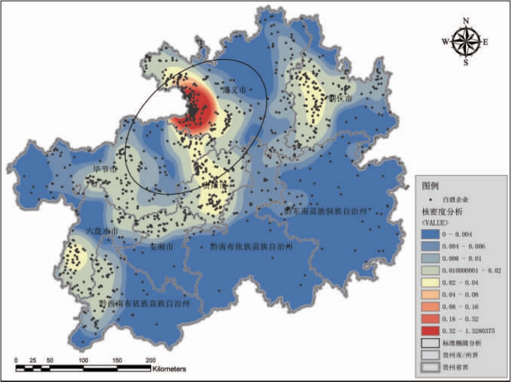 图3 核密度与标准偏差椭圆法分析白酒生产企业空间分布结果Fig.3 Spatial distribution results of Baijiu production enterprises analysis by kernel density and standard deviation ellipse method