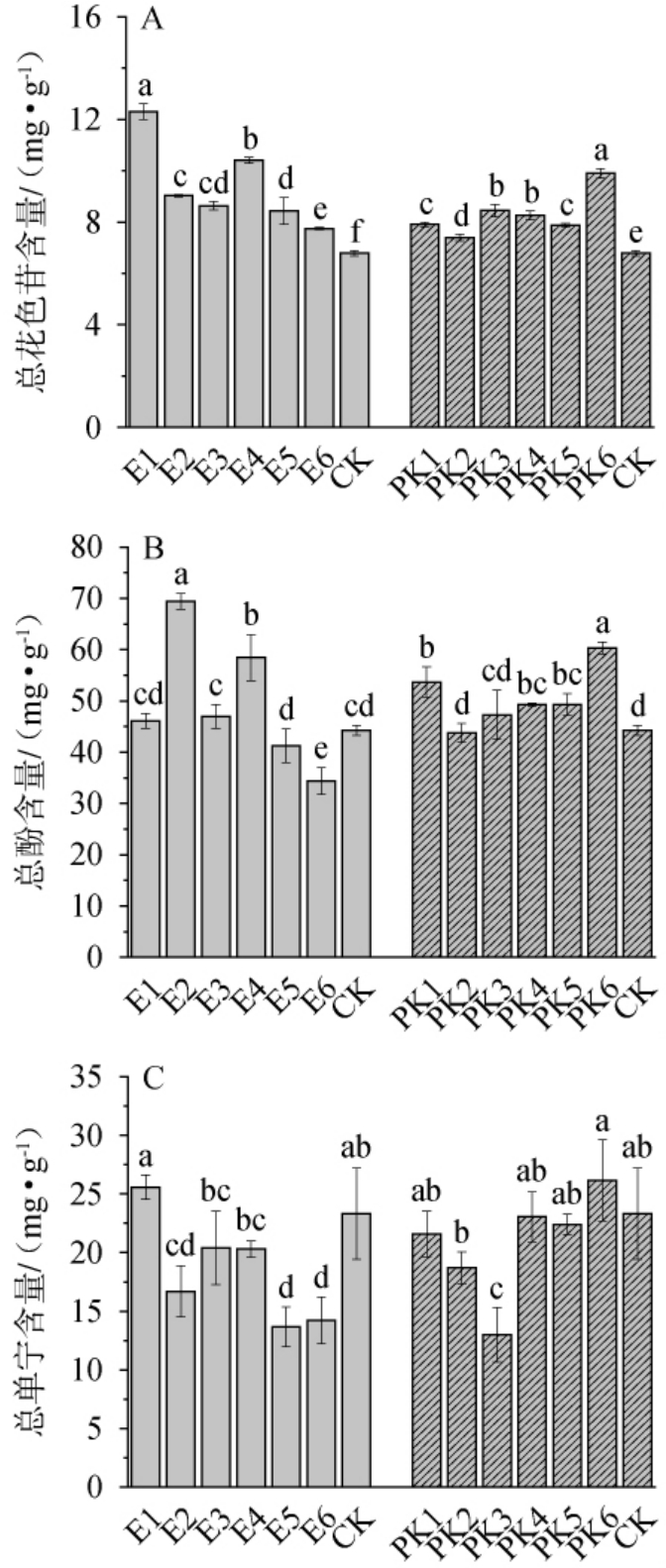 浆果转色初期+转色完成期+转色完成后2周连续喷施磷酸二氢钾(PK6)果皮总酚含量(60.33 mg/g)最高,较对照(CK)显著提高了36.28%(P<0.05),浆果转色初期喷施磷酸二氢钾(PK1)较对照(CK)显著提高了21.21%(P<0.05),浆果转色初期+转色完成期喷施磷酸二氢钾(PK4)、转色完成期+转色完成后2周连续喷施磷酸二氢钾(PK5)较对照(CK)分别显著提高了11.27%和11.36%(P<0.05),其他磷酸二氢钾喷施处理(PK2、PK3)与对照(CK)没有显著差异(P>0.05)。 磷能够通过提高三磷酸腺苷(adenosine triphosphate,ATP)活性影响醇酯的合成,钾能提高叶片的光合作用、CO2同化、叶片与果实间糖分的转移,从而间接有益于果实成熟过程中酚类物质的合成[30]。