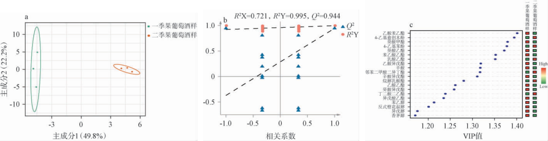 Fig.1 Orthogonal partial least squares discriminant analysis (a) of volatile flavor compounds, results of the permutation test (b),variable importance in the projection values (c) of two-crop grape wine of ′Yeniang No.2′