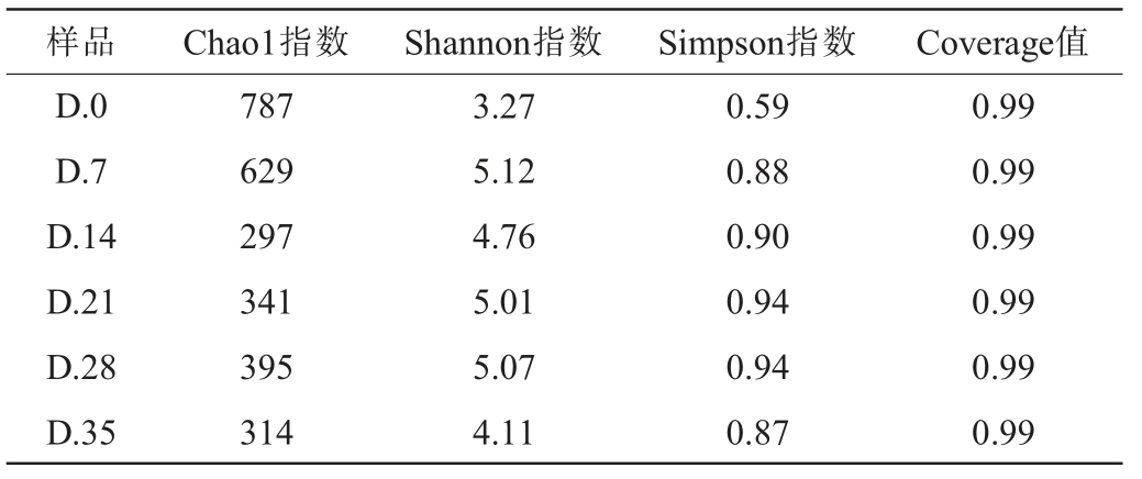 样品 Chao1指数 Shannon指数 Simpson指数 Coverage值D.0 D.7 D.14 D.21 D.28 D.35 787 629 297 341 395 314 3.27 5.12 4.76 5.01 5.07 4.11 0.59 0.88 0.90 0.94 0.94 0.87 0.99 0.99 0.99 0.99 0.99 0.99