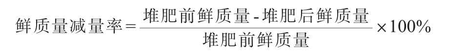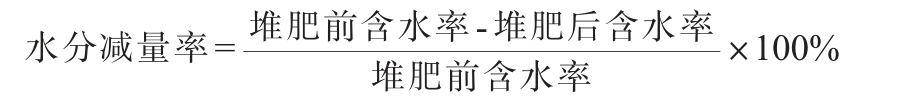 干物质减量率=1-(堆肥后鲜质量-堆肥后鲜质量×堆肥后含水率)/(堆肥前鲜质量-堆肥前鲜质量×含水率)×100%