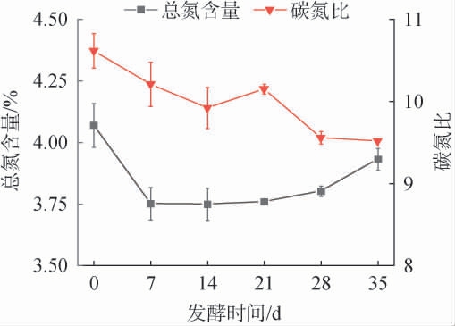 超高温好氧堆肥过程中堆肥总氮含量和碳氮比的变化见图4。