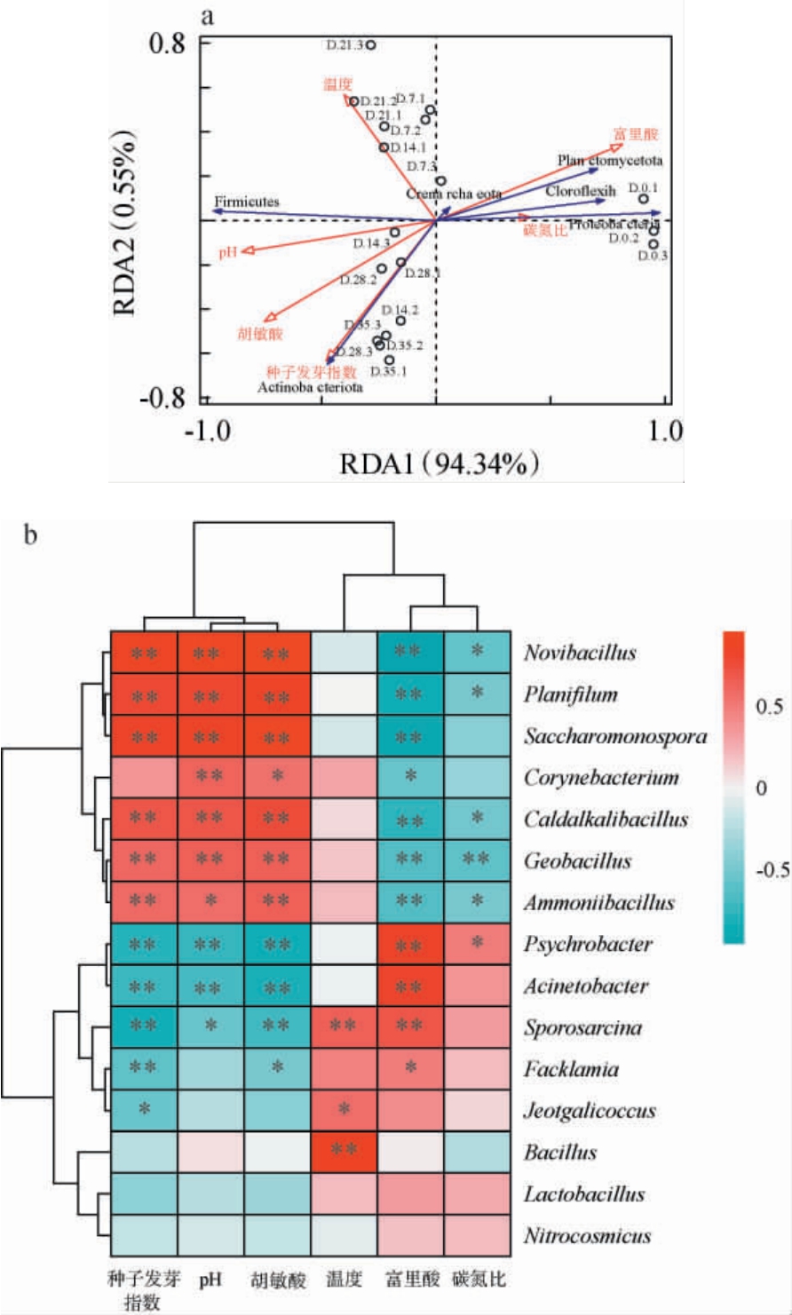 选取平均相对丰度排名前6的细菌门和前15的细菌属,研究堆肥过程中细菌群落变化与腐熟度相关理化指标间的相关性,结果见图9。由图9a可知,两个坐标轴累计方差贡献率为94.89%,共解释了94.89%的样本信息,说明堆肥过程中理化指标变化与细菌群落结构有关。厚壁菌门与堆肥温度、pH值、胡敏酸含量和种子发芽指数呈正相关,与富里酸含量和碳氮比呈负相关,说明厚壁菌门利于堆肥温度升高、植物毒性的降低和堆肥的腐熟;在堆肥初始阶段,变形菌门、绿弯菌门(Chloroflexi)和浮霉菌门(Planctomycetota)对样品的影响较大,主要与富里酸含量和碳氮比呈正相关,与pH值、胡敏酸含量和种子发芽指数呈负相关;在堆肥后期,放线菌门对样品的影响较大,尤其与种子发芽指数和胡敏酸含量呈正相关,这表明堆肥后期放线菌门相对丰度的增加可以有效的提高堆肥的腐熟度并降低堆肥的毒性,这也与杨萍萍等[23-25]的研究结果一致。