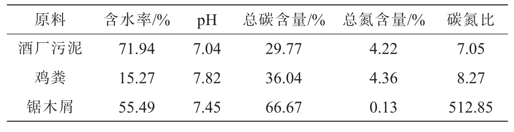 酒厂污泥(脱水)、鸡粪和锯木屑:产地四川。堆肥原料的基本理化性质见表1。