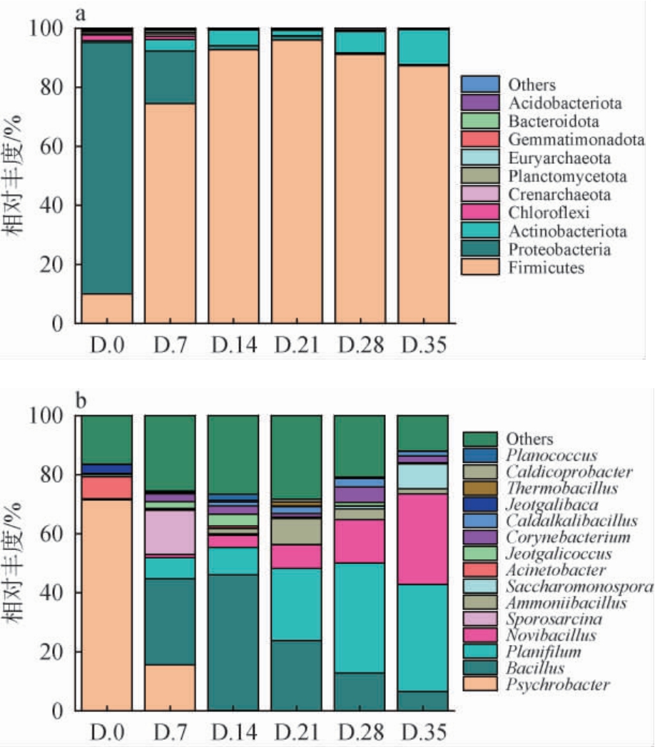 图a中Others代表平均相对丰度排名前5之后的细菌门,图b中Others表示平均相对丰度排名前15之后的细菌属。