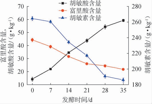 腐殖质含量是体现堆肥腐熟度的重要指标[14],超高温好氧堆肥过程中富里酸、胡敏酸和胡敏素含量的变化见图6。由图6可知,原料中总腐殖质(腐植酸与胡敏素之和)含量丰富,达到324.85 g/kg;堆肥过程中,胡敏酸含量持续上升,由初始的14.23 g/kg上升至堆肥结束时的59.24 g/kg,而富里酸和胡敏素含量持续下降,分别由初始的44.29 g/kg、264.48 g/kg下降至堆肥结束时的21.66 g/kg、185.88 g/kg,这与唐显梅等[15]的研究结果类似。 分析原因可能是,堆肥初期富里酸含量较高,容易被微生物消耗或转化为更复杂的胡敏酸[16];胡敏素是与矿物质紧密结合的腐殖物质,由于微生物的代谢消耗导致胡敏素含量下降[17]。