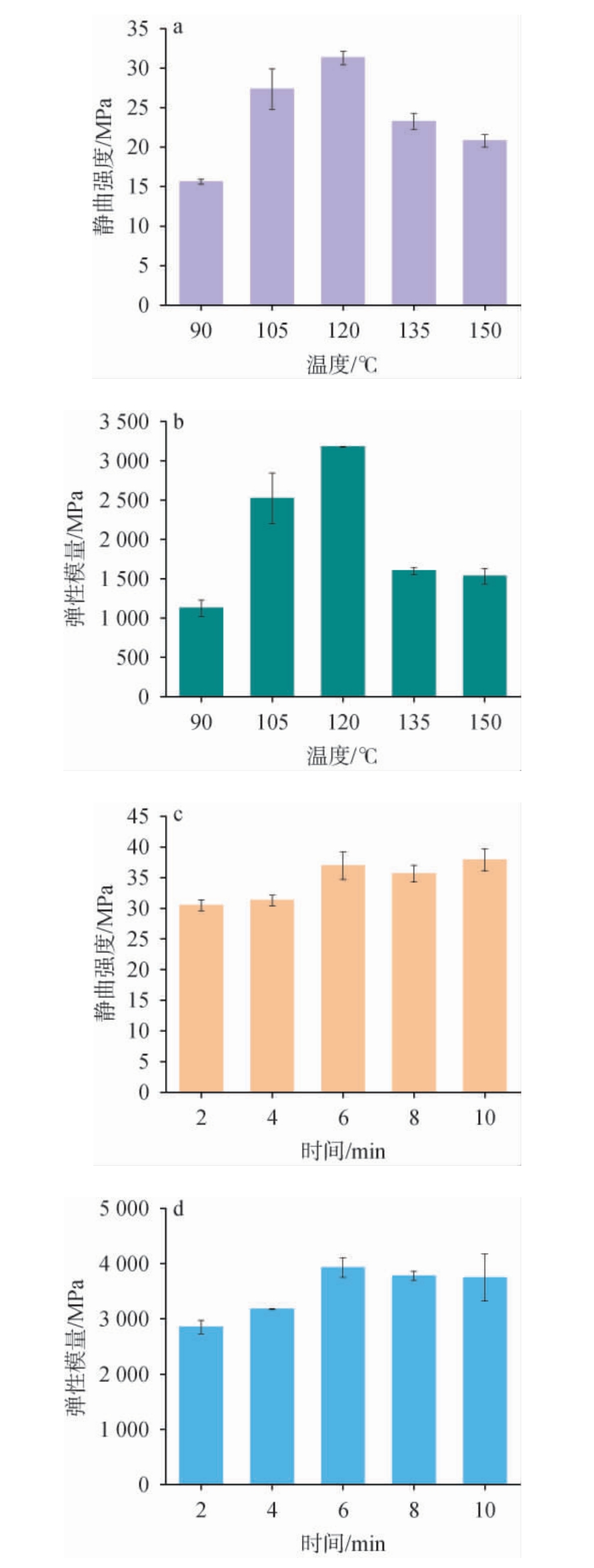 图10 不同热压温度(a,b)及热压时间(c,d)对酒糟-MDI复合材料的静曲强度和弹性模量的影响