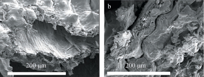 图11 活化前(a)与活化后(b)酒糟-MDI复合材料截面的场发射扫描电子显微镜图