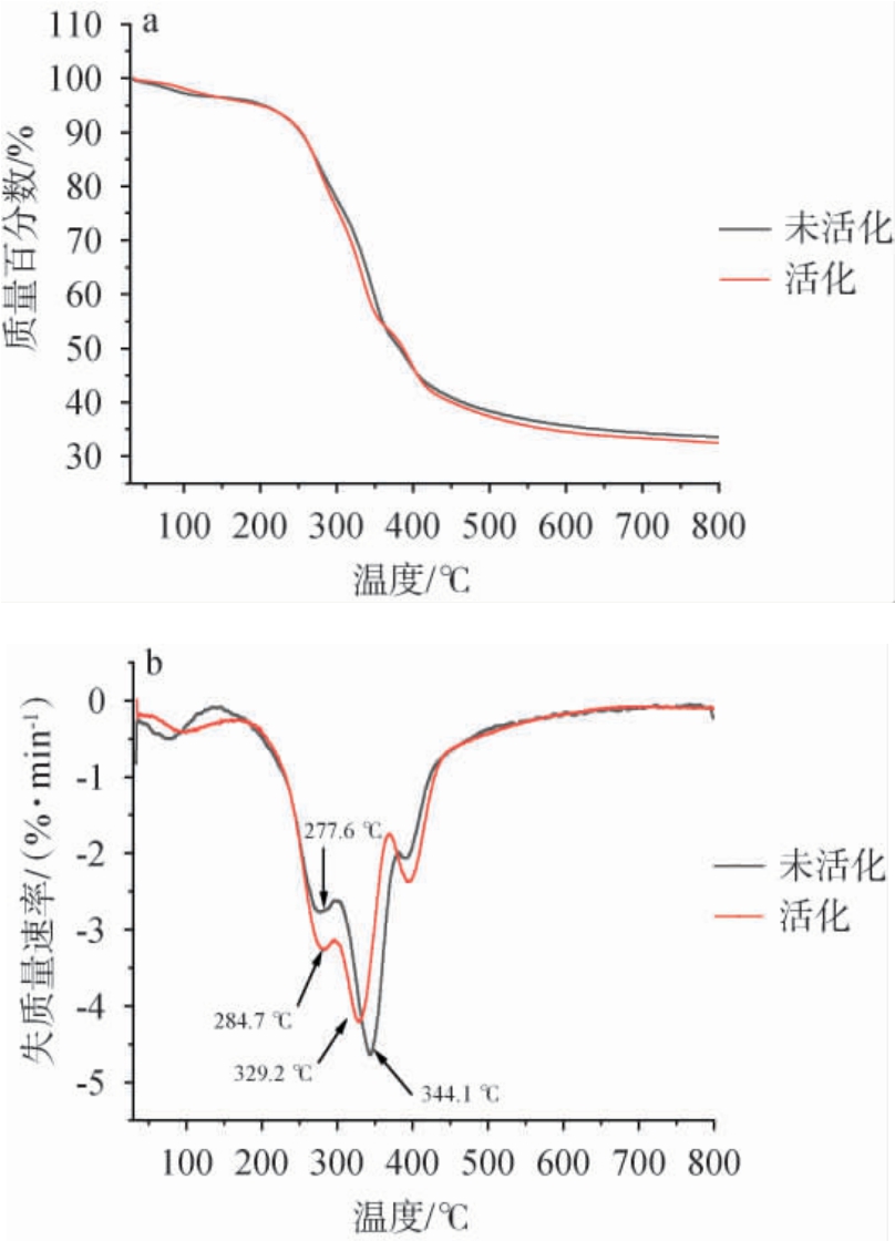 为探究活化对复合材料热稳定性的影响,对活化前后酒糟制备的复合材料进行了热重分析,结果见图12。由图12a热重(thermo gravimetric,TG)曲线可知,活化前后酒糟与MDI制备的复合材料,在30~200 ℃阶段TG曲线基本重合,无明显变化;在200~800 ℃阶段,活化后酒糟-MDI复合材料热解速率略高;在热解完成(800 ℃)时,活化后酒糟-MDI复合材料的残渣量有所减少,表明活化后酒糟中的木质素、小分子的灰分等热解温度较高的物质得到了有效的去除,也表明活化使得酒糟纤维的聚合度、结晶度得到降低,从而使酒糟纤维的结构变得更加疏松,有助于纤维素、半纤维素和木质素的分离与热解。