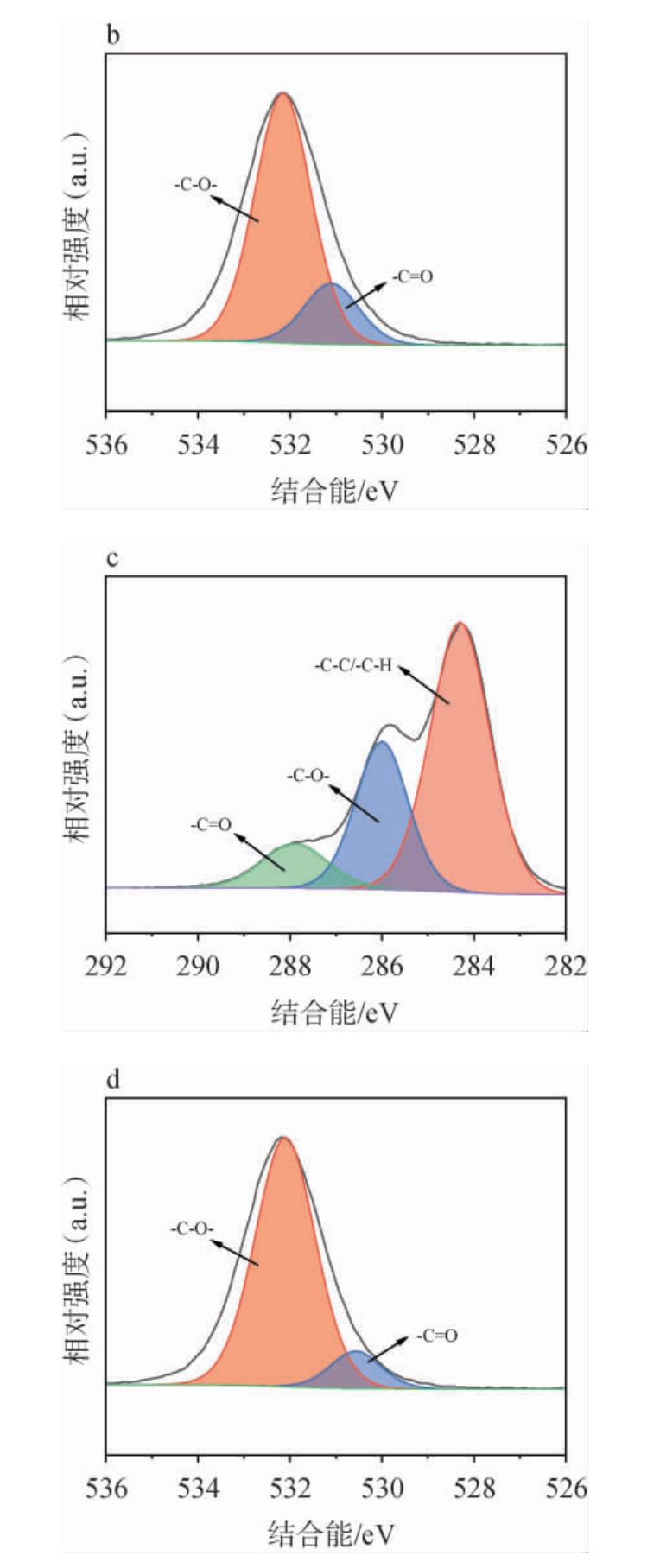 活化前后酒糟-MDI复合材料表面C、O元素的分峰结果见图8。