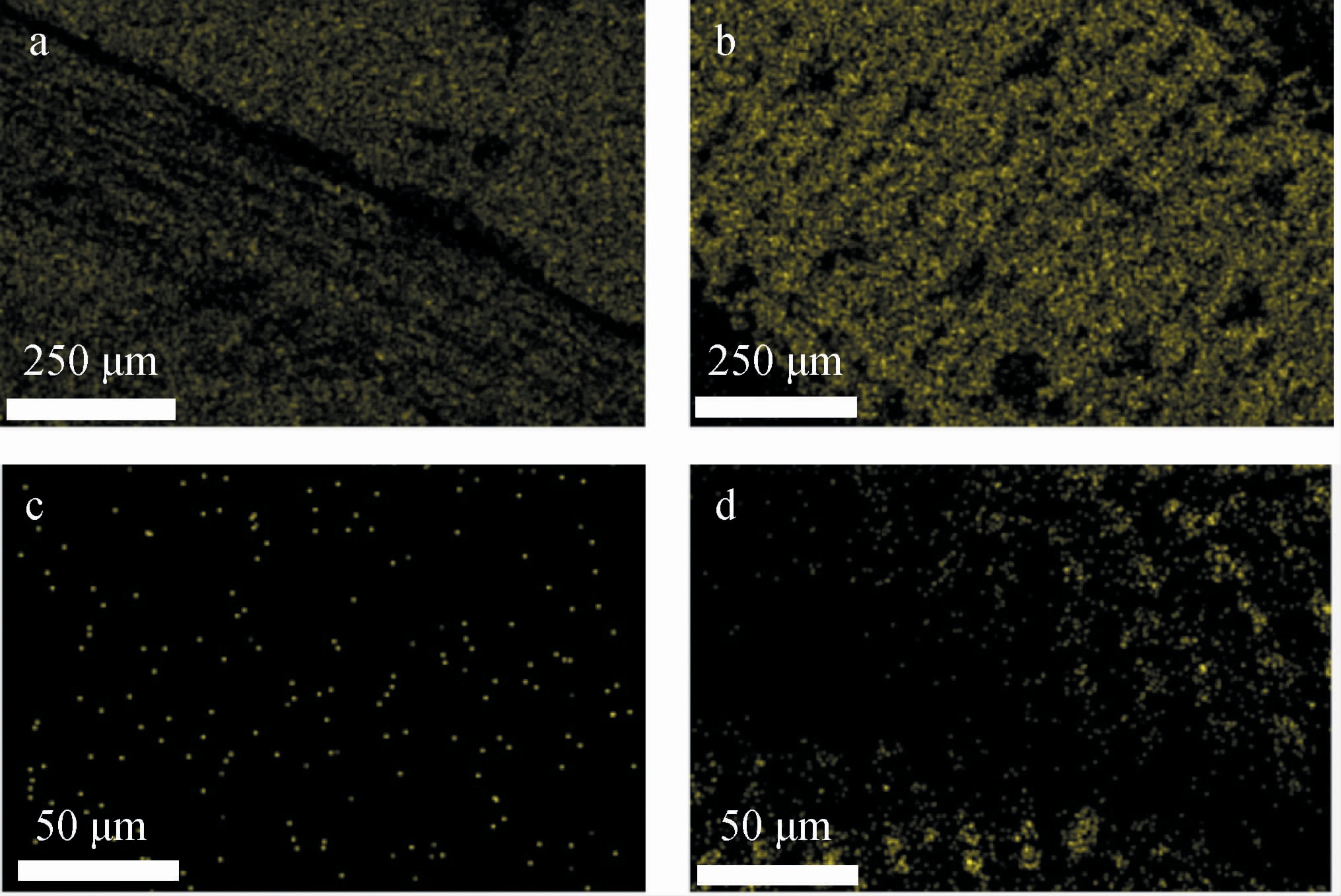 图2 活化前酒糟内表面(a)和外表面(b)及活化后酒糟内表面(c)和外表面(d)硅元素含量分布