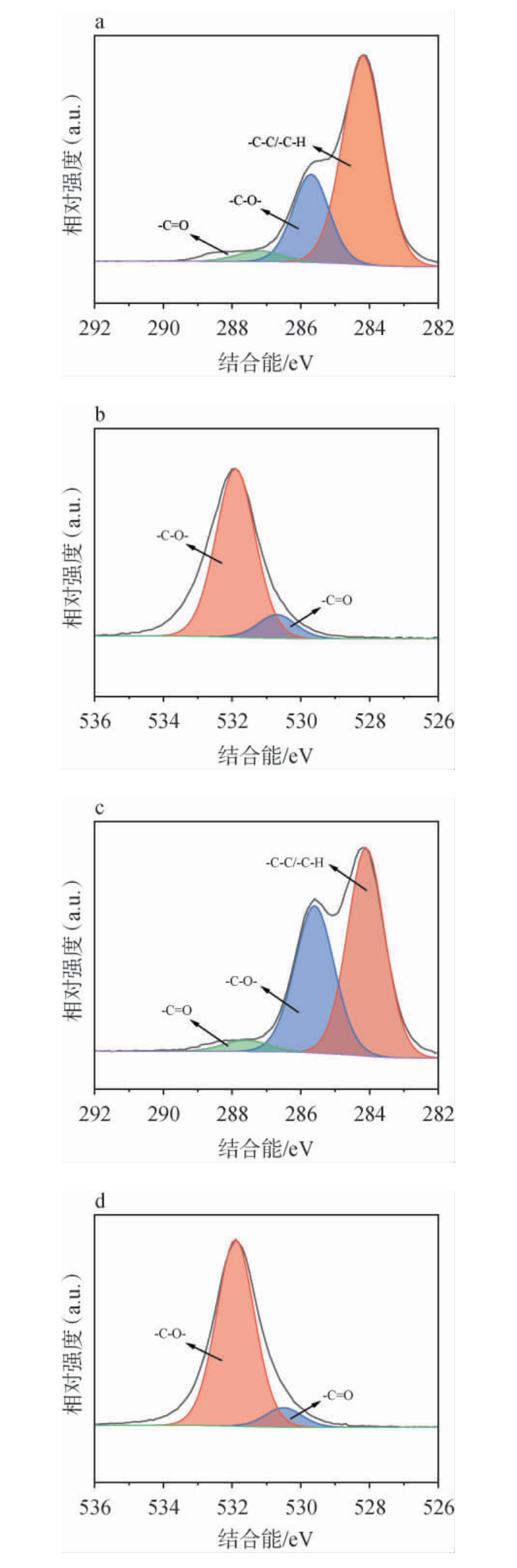 图5 活化前(a,b)和活化后(c,d)酒糟表面C、O元素的1s轨道的X射线光电子能谱图