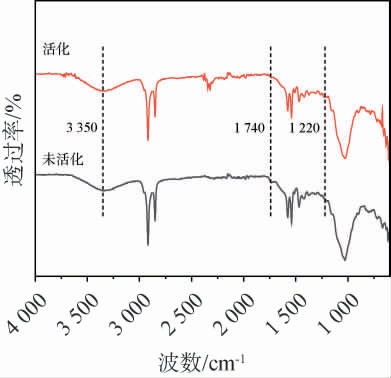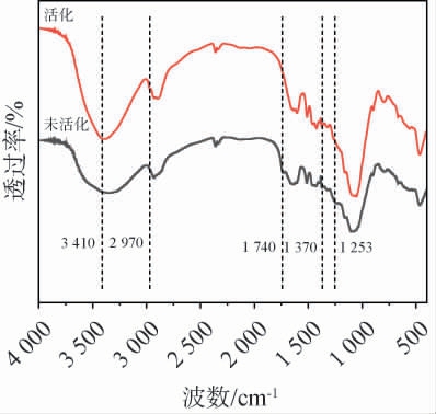 Fig.3 Fourier transform infrared spectroscopy of distiller's grains before and after activation