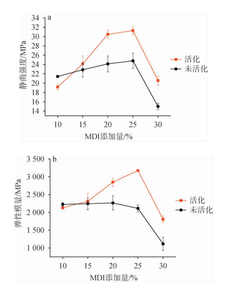图9 不同MDI添加量对酒糟-MDI复合材料静曲强度(a)和弹性模量(b)的影响