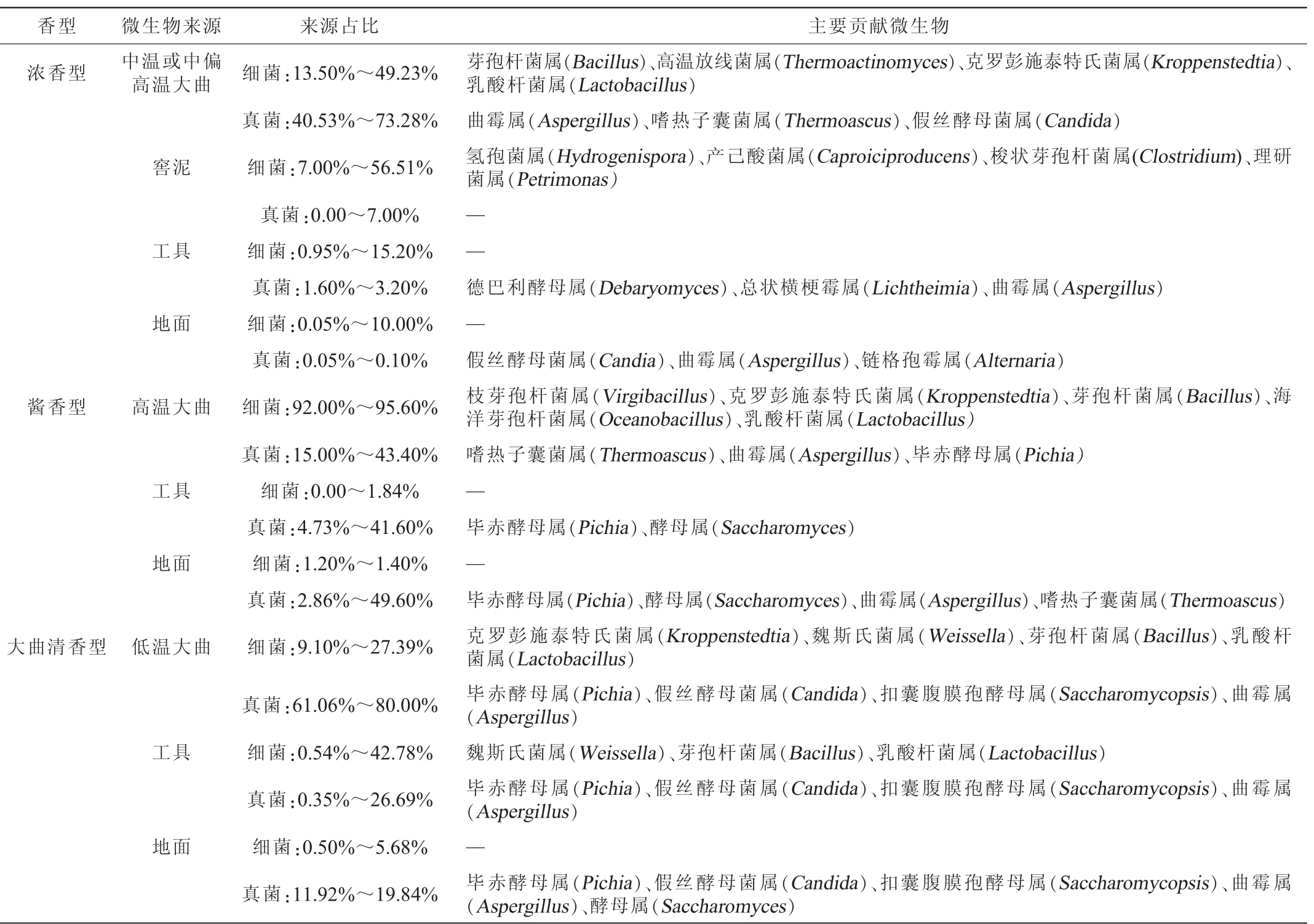 香型 微生物来源 来源占比 主要贡献微生物浓香型 中温或中偏高温大曲窖泥芽孢杆菌属(Bacillus)、高温放线菌属(Thermoactinomyces)、克罗彭施泰特氏菌属(Kroppenstedtia)、乳酸杆菌属(Lactobacillus)曲霉属(Aspergillus)、嗜热子囊菌属(Thermoascus)、假丝酵母菌属(Candida)氢孢菌属(Hydrogenispora)、产己酸菌属(Caproiciproducens)、梭状芽孢杆菌属(Clostridium)、理研菌属(Petrimonas)工具——高温大曲酱香型工具地面地面大曲清香型低温大曲细菌:13.50%~49.23%真菌:40.53%~73.28%细菌:7.00%~56.51%真菌:0.00~7.00%细菌:0.95%~15.20%真菌:1.60%~3.20%细菌:0.05%~10.00%真菌:0.05%~0.10%细菌:92.00%~95.60%真菌:15.00%~43.40%细菌:0.00~1.84%真菌:4.73%~41.60%细菌:1.20%~1.40%真菌:2.86%~49.60%细菌:9.10%~27.39%德巴利酵母属(Debaryomyces)、总状横梗霉属(Lichtheimia)、曲霉属(Aspergillus)—假丝酵母菌属(Candia)、曲霉属(Aspergillus)、链格孢霉属(Alternaria)枝芽孢杆菌属(Virgibacillus)、克罗彭施泰特氏菌属(Kroppenstedtia)、芽孢杆菌属(Bacillus)、海洋芽孢杆菌属(Oceanobacillus)、乳酸杆菌属(Lactobacillus)嗜热子囊菌属(Thermoascus)、曲霉属(Aspergillus)、毕赤酵母属(Pichia)—毕赤酵母属(Pichia)、酵母属(Saccharomyces)—毕赤酵母属(Pichia)、酵母属(Saccharomyces)、曲霉属(Aspergillus)、嗜热子囊菌属(Thermoascus)克罗彭施泰特氏菌属(Kroppenstedtia)、魏斯氏菌属(Weissella)、芽孢杆菌属(Bacillus)、乳酸杆菌属(Lactobacillus)毕赤酵母属(Pichia)、假丝酵母菌属(Candida)、扣囊腹膜孢酵母属(Saccharomycopsis)、曲霉属(Aspergillus)魏斯氏菌属(Weissella)、芽孢杆菌属(Bacillus)、乳酸杆菌属(Lactobacillus)毕赤酵母属(Pichia)、假丝酵母菌属(Candida)、扣囊腹膜孢酵母属(Saccharomycopsis)、曲霉属(Aspergillus)地面 细菌:0.50%~5.68%真菌:11.92%~19.84%工具真菌:61.06%~80.00%细菌:0.54%~42.78%真菌:0.35%~26.69%—毕赤酵母属(Pichia)、假丝酵母菌属(Candida)、扣囊腹膜孢酵母属(Saccharomycopsis)、曲霉属(Aspergillus)、酵母属(Saccharomyces)